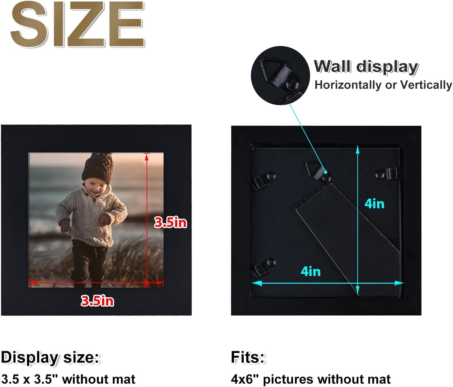 - QUICK INSTALLATION:The easy-open density board on the back of these frames allows for quick and hassle-free loading and changing of pictures, ensuring that they stay securely in place. No matter where you place these 4x4 black wood frames, they will instantly bring a bright and lively look to any space.