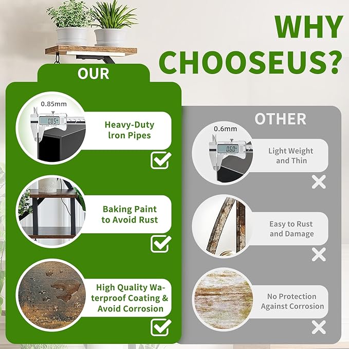 - Using Well-Made Material: This frame is made of heavy duty steel frame and well-made MDF boards. The heavy duty iron tube is coated with a special baking paint that prevents corrosion and rust. The iron pipe joints are welded with well-made iron to with stand different kinds of potted plants, Each layer consists of thickened particleboard offering resistance to cracking and coated with water-resistant layer to avoid corrosion, warping and curling caused by residual water
