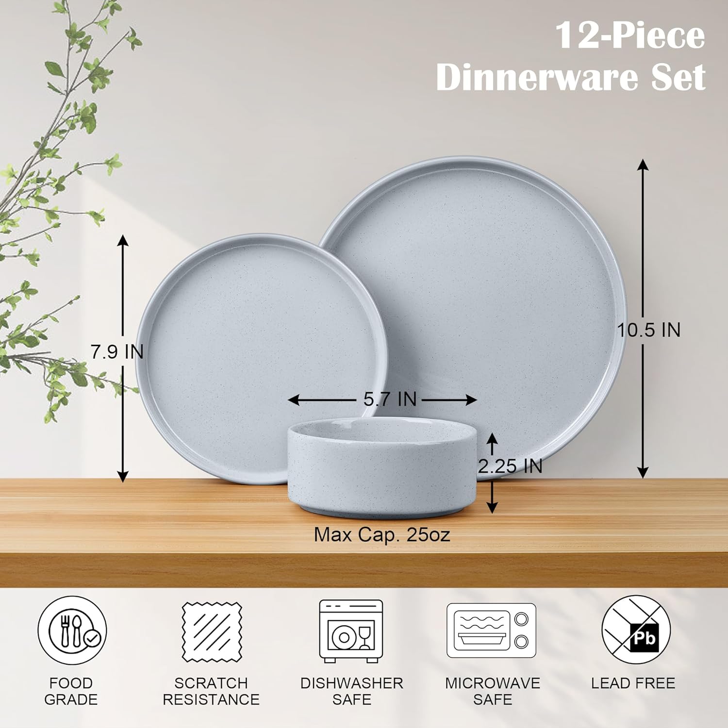 E-far Stoneware Dinnerware Sets, 12-Piece Plates and Bowls Dish Set for 4, Kitchen Modern Dinning Ware, Chip and Scratch Resistant, Microwave & Dishwasher Safe, Speckled Gray