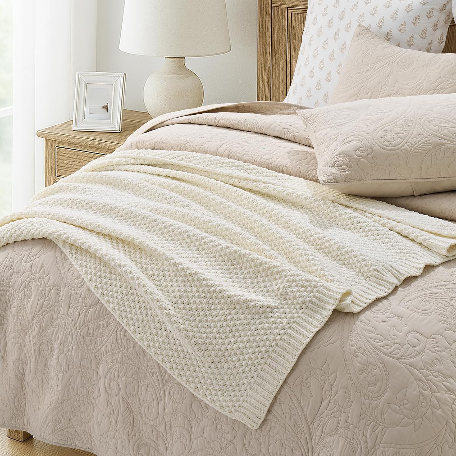 EVERGRACEHOME Chunky Chenille Knit Throw Blanket for Couch, Soft Luxurious Moss Stitch Blankets for Bed, Cozy Decorative Farmhouse Knitted Throws for Sofa, Ivory White, 50" x 60"