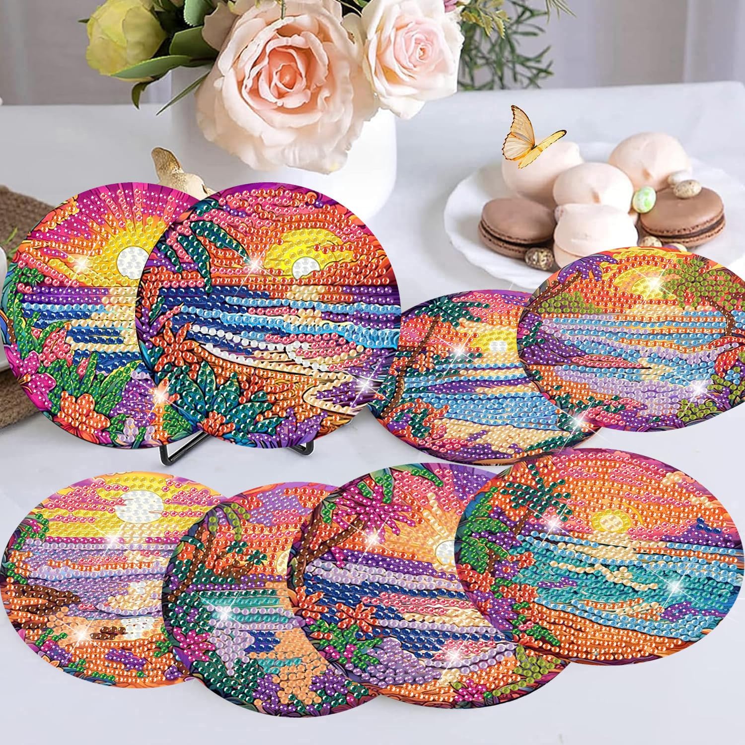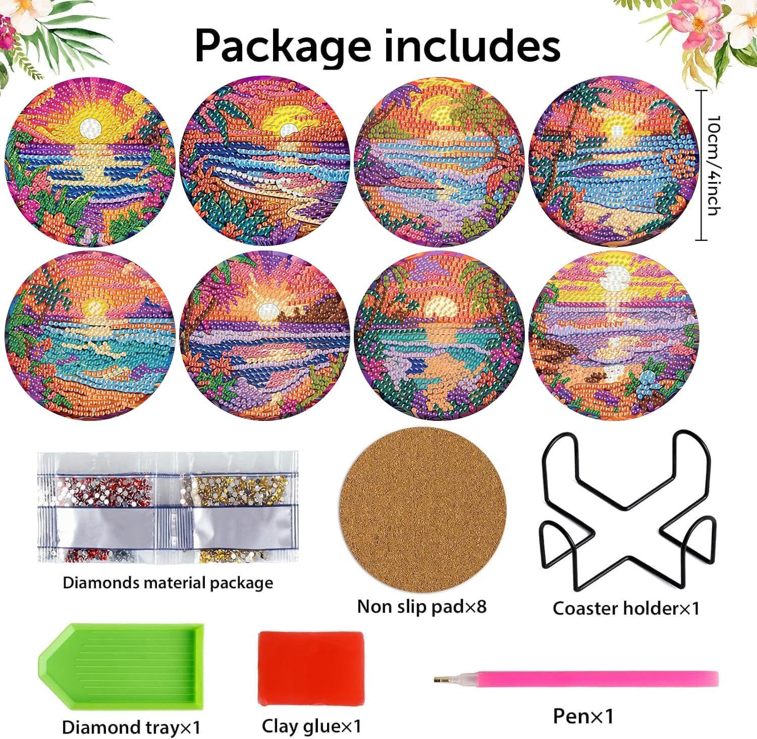 - 【Package Include】 You will get 8 pieces diamond art painting coasters in different sunset beach theme, 8 pieces stickable cork bases, 1 pieces coaster holder, 1 pieces colorful diamonds set, 1 pieces clay glue, 1 pieces diamond art pen, 1 pieces diamond tray, contains all the accessories and tools you need for DIY diamond art painting coasters.