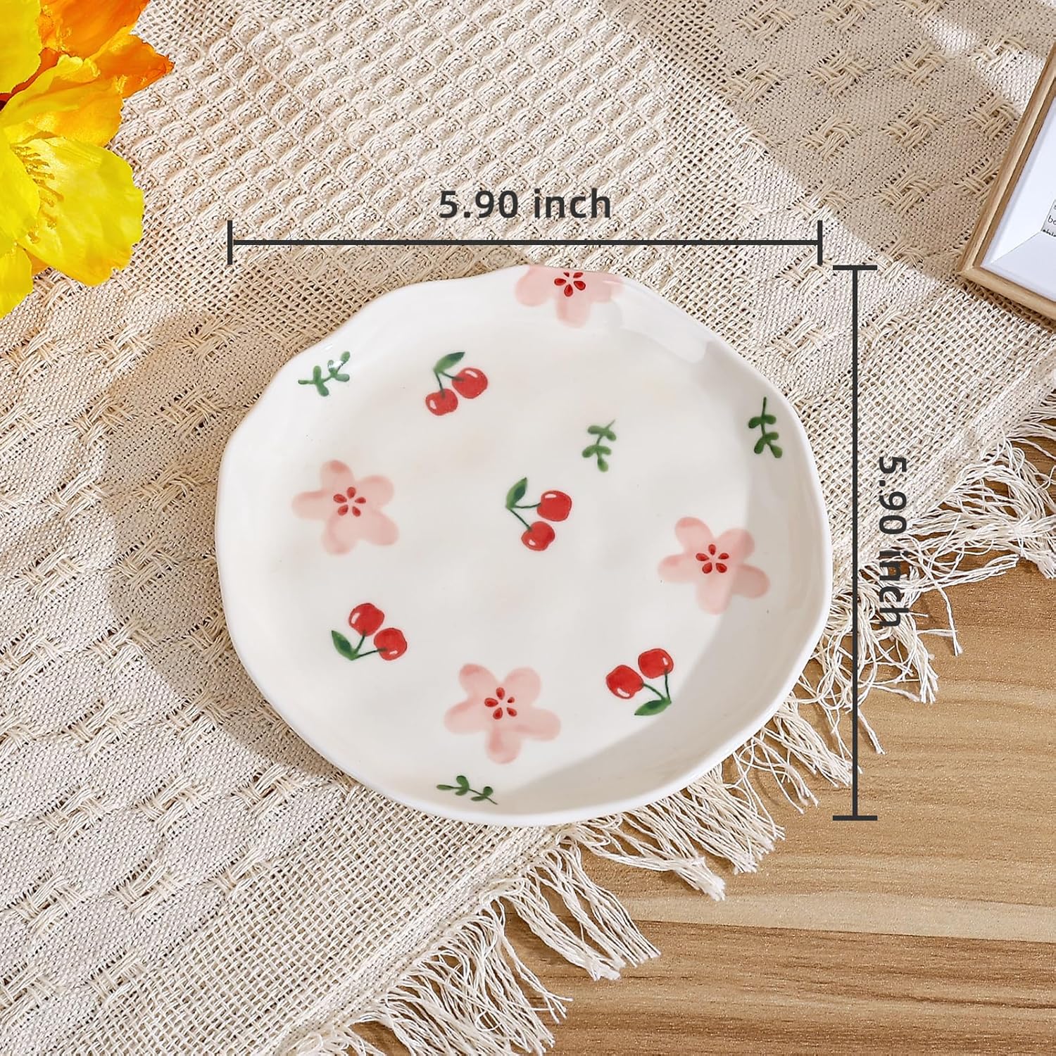 Koythin Ceramic Dessert Plates, Cute Fruits Dinner Plate, Creative Plates Design, Printed Flowers Dinnerware for Office and Home, Kitchen Plates for Desserts (Pink Cherry Flowers)