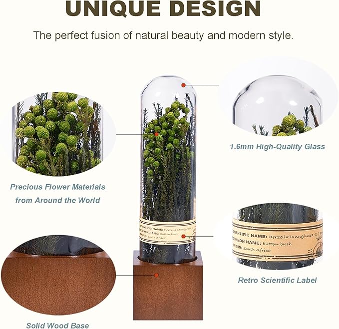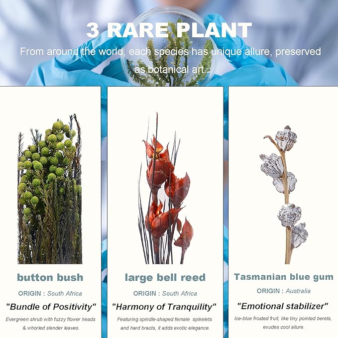 - 🌟【3 Unique Immortal REAL Plants】Handpicked Bell Grass Burgundy, Eucalyptus Bud, and Berzelia Lanuginosa Green, each preserved in high-quality glass for long-lasting beauty.