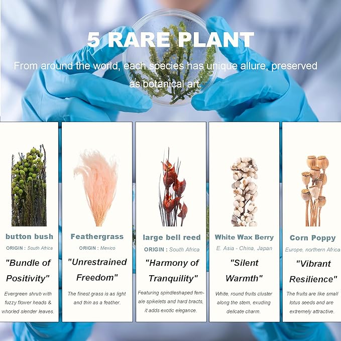 - 🌟【5 Unique Immortal REAL Plants】Handpicked Bell Grass, Nassella Tenuissima, Papaver Rhoeas, Berzelia Lanuginosa, and Sapium Sebiferum, each preserved in high-quality glass for long-lasting beauty.