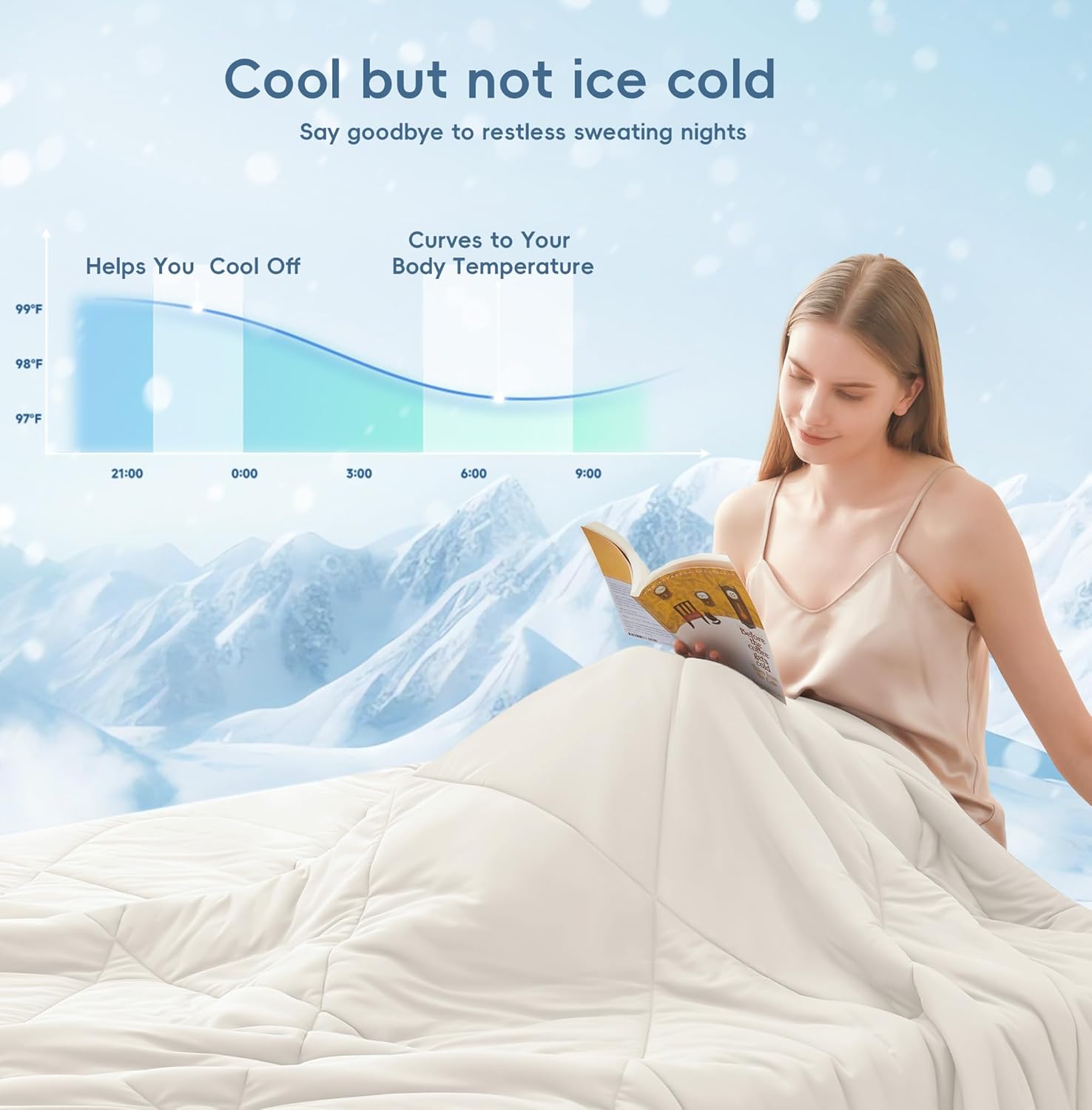 - Use Tips: For optimal enjoyment, we advise you use our cooling comforter in an air-conditioned room as a bed cover. When temperatures soar, set your air conditioner to around 78°F or lower and use our comforter alone without other extra covers for maximum cooling sensation. If necessary, add an extra blanket or top sheet when extra warmth needed