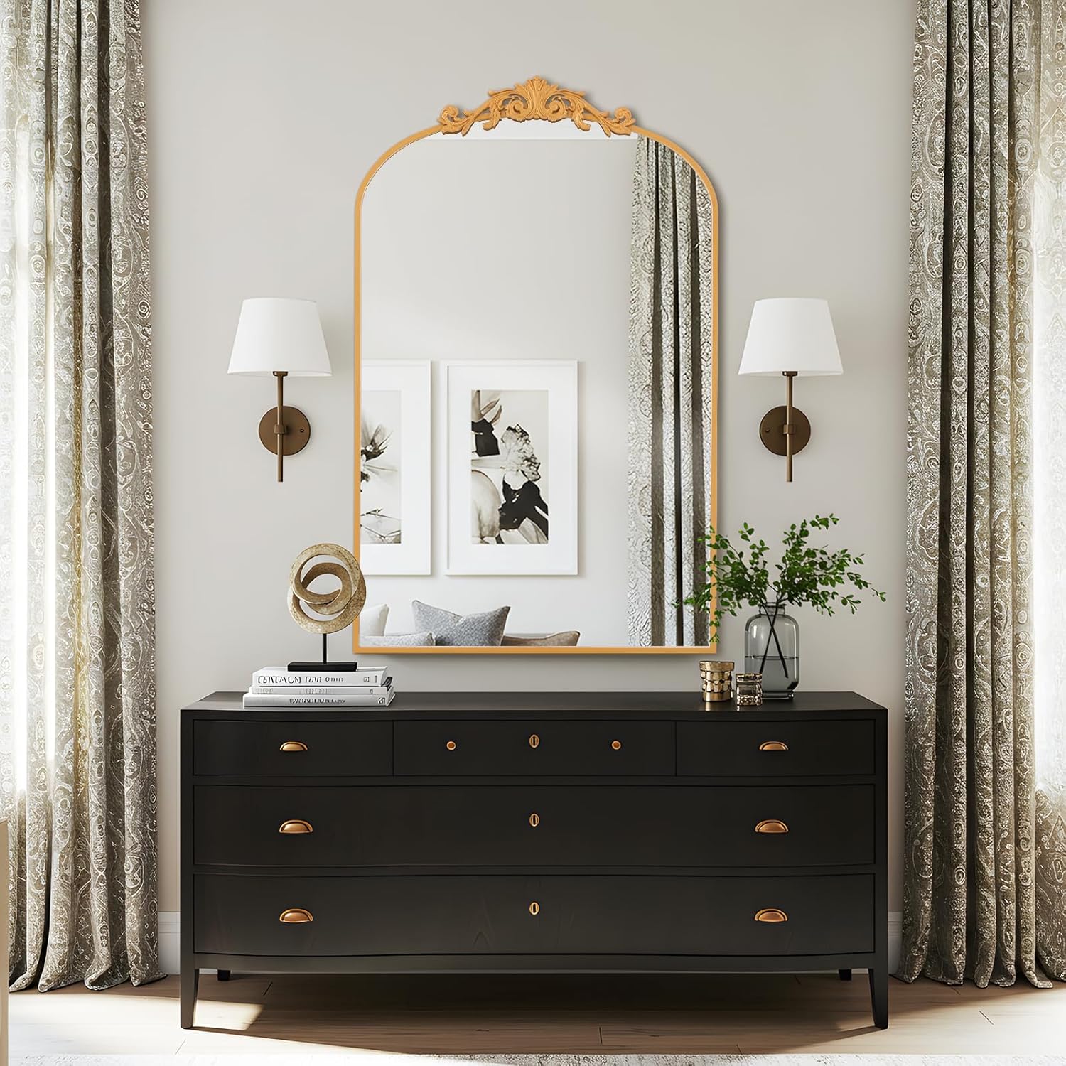 Filigree Arched Wall Mirror 26"x38" Retro Wall-Mounted Mirror with Vintage Ornate Carved Applique Hanging Leaning Antique Home Decor Mirror for Fireplace Living Room Entryway Hallway Bathroom, Gold