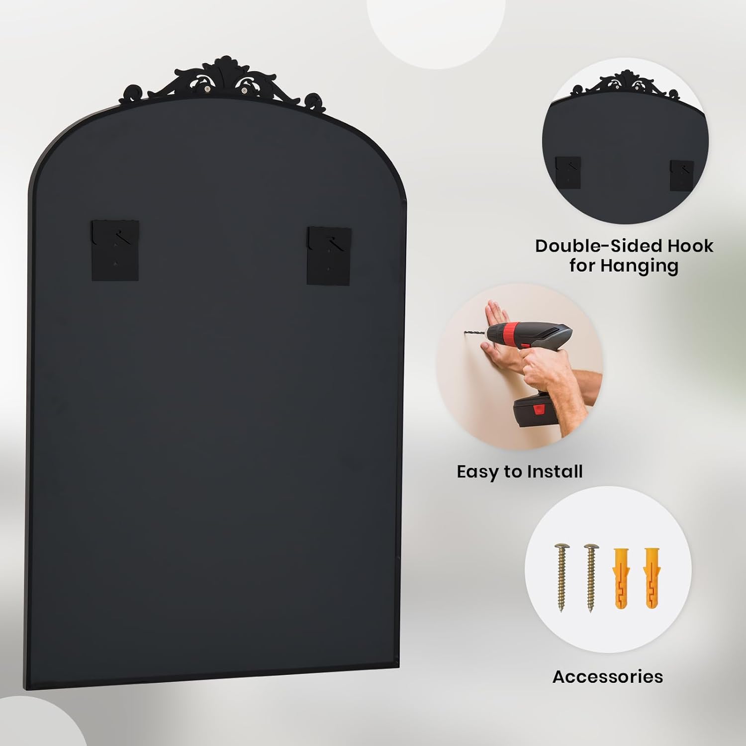 Filigree Arched Wall Mirror 26"x38" Retro Wall-Mounted Mirror with Vintage Ornate Carved Applique Hanging Leaning Antique Home Decor Mirror for Fireplace Living Room Entryway Hallway Bathroom, Black