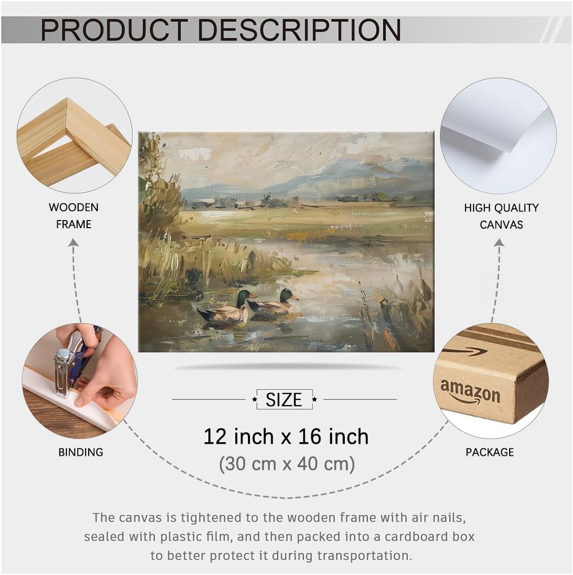 - Duck Decor Poster:Oil paintings wall art size is 12x16 inch,this landscape art are wrapped and stretched over wood frame, to create an immersive 3D effect that makes the artwork look great