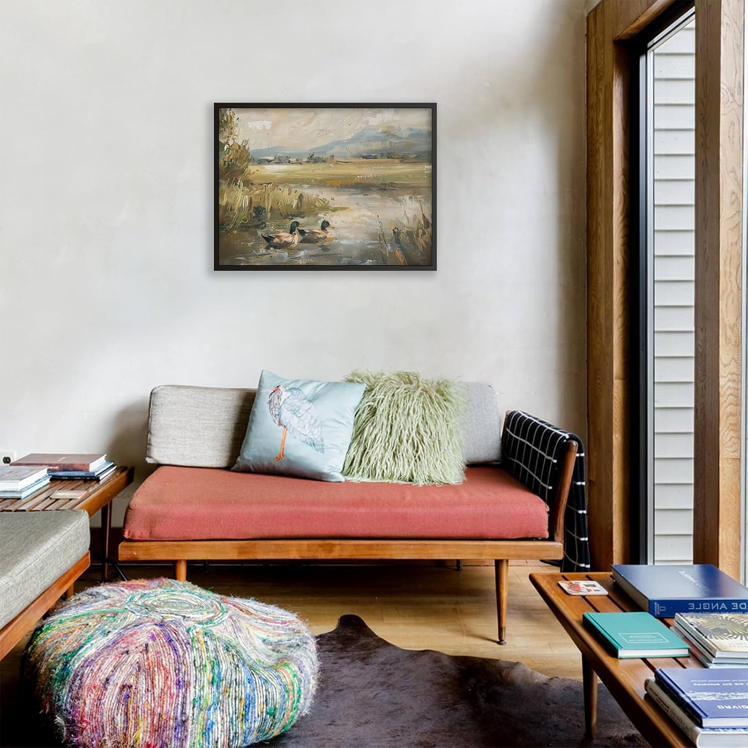 Mallard Duck Pond Poster Animal Farmhouse Canvas Wall Art Vintage Duck Painting Oil Painting 12x16 inch Black Framed Bird Hunter Gift for Rustic Cabin Nursery Wall Decor