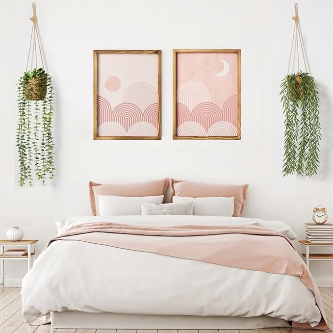 - 2-in-1 Wall or Shelf Decor: These small fake plants are easy to style. Hang them on wall or ceiling with the included hooks, or place them on shelves, tables, bookshelves, desks, and windowsills for an instant green refresh. Their simple yet versatile design fits farmhouse, rustic, modern, minimalist, and boho vibes
