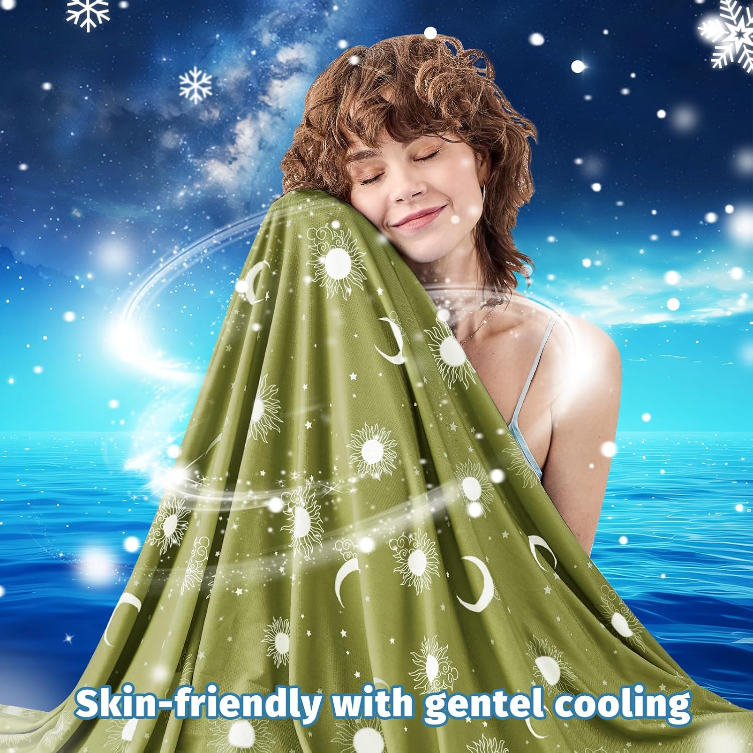 - 【PORTABLE & UNIQUE】 Different from other solid color cooling blankets on the market, this blanket with star, moon and sun pattern can not only provide a quiet and cool night feeling, but also is very suitable for other occasions and even when going out, such as camping, picnic, travel, in cars, trains, airplanes, offices, travel, cinemas, parks, beaches and other occasions.
