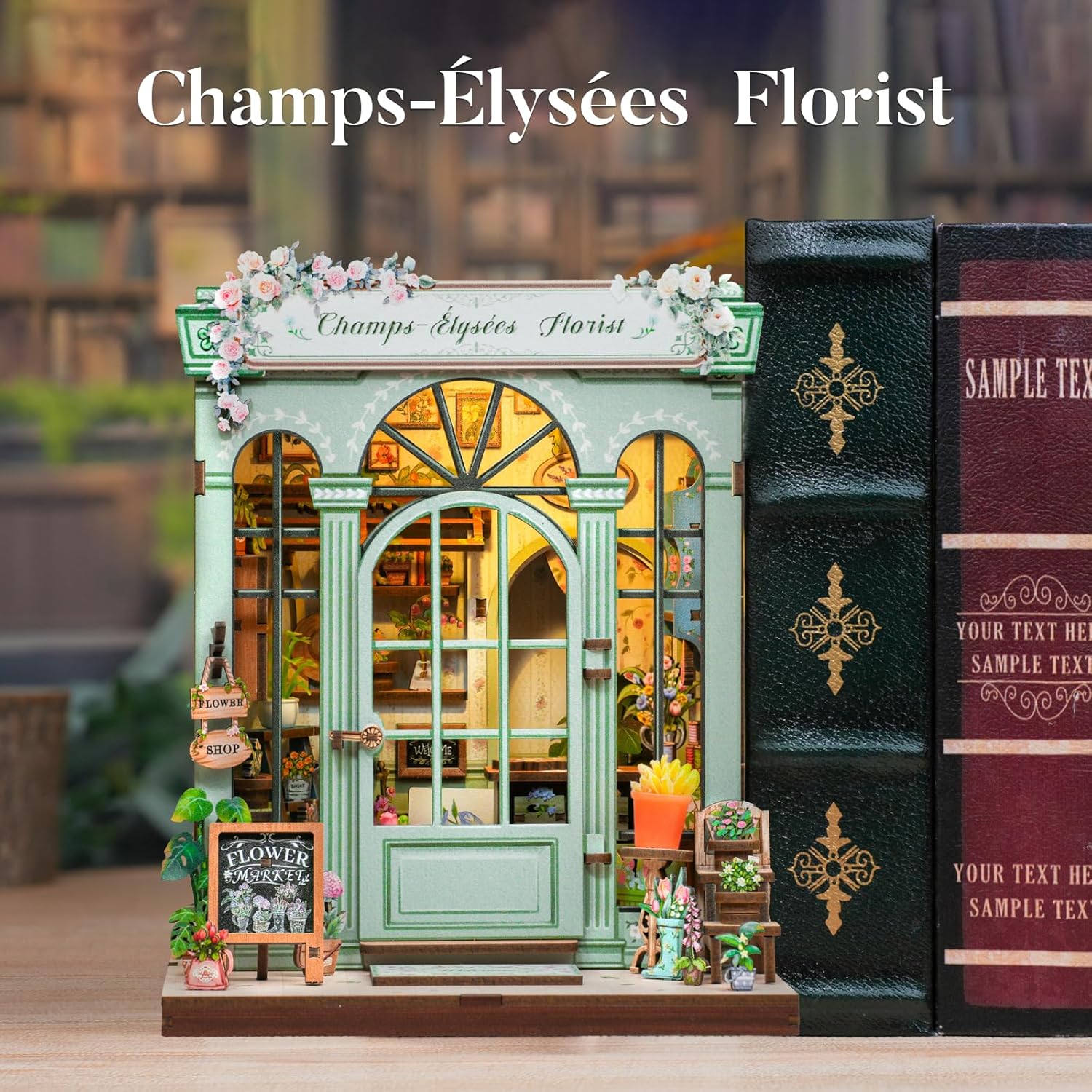 - 【Book Nook Kit for Adults - Champs-Élysées Florist】This Book Nook Kit is for anyone who enjoys crafting and loves a touch of whimsy. The theme is with intricate details that truly bring a little slice of Paris to your bookshelf. It's more than just a bookshelf decoration, it's a little world you create yourself. It is combination of a puzzle, a scale model and a shared teen and adult bonding project