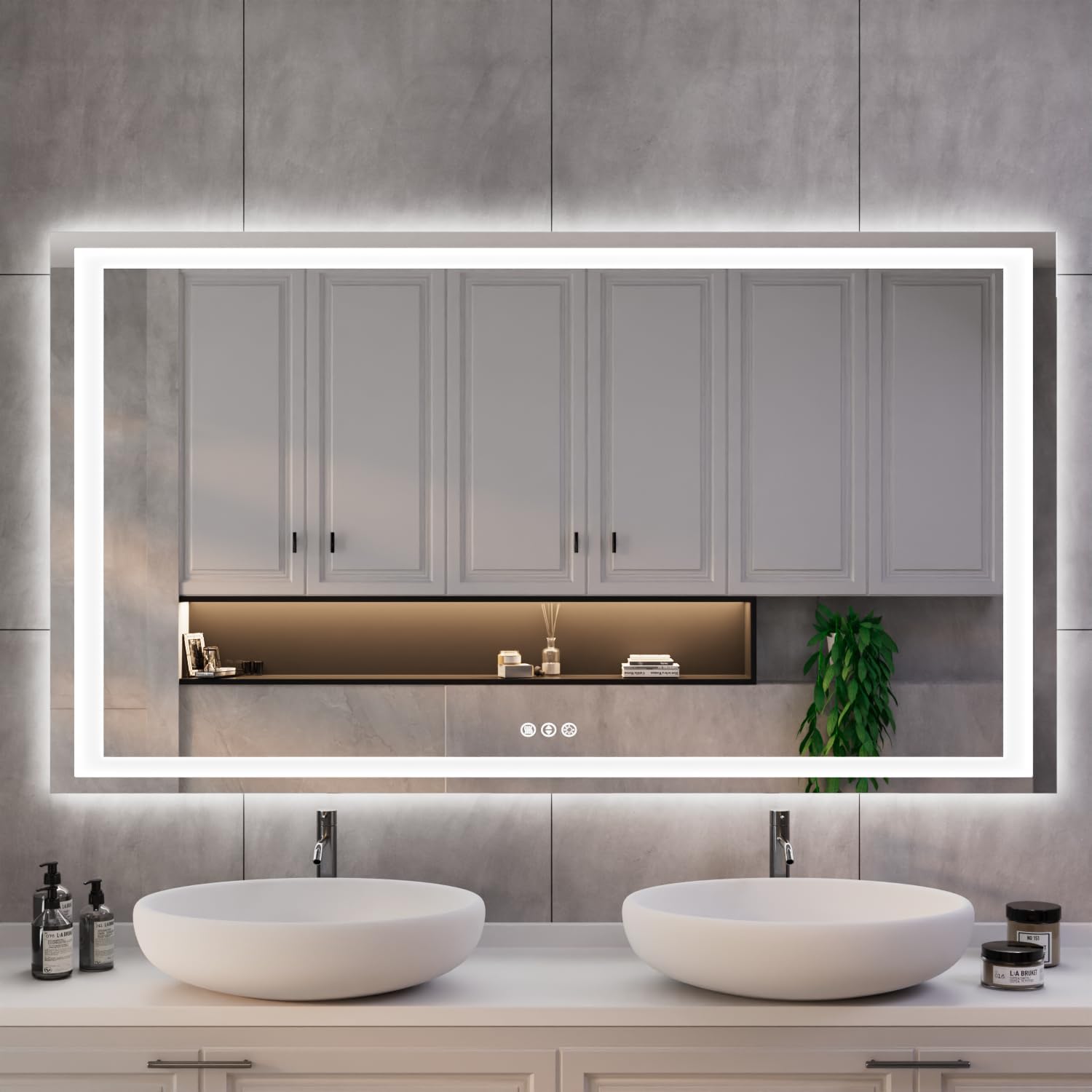 - 3 LITTLE CONTROL BUTTONS MAKES THE BATHROOM HIGH-TECH - ①Waterproof and fogless as a defogger, and will automatically turn off after 1 hour. ②Change the color temperature between 3000 K to 6000 K the intensity and proper room coloration is easily achieved. ③ Adjust the brightness up and down to say goodbye to traditional wall-mounted lights. ④Built-in smart memory function with brightness setup will be remembered for your next use when it is controlled by wall switch.