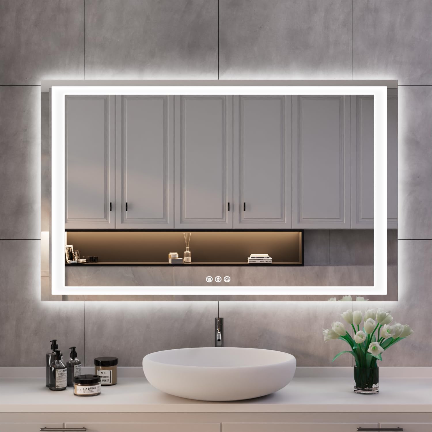 - 3 LITTLE CONTROL BUTTONS MAKES THE BATHROOM HIGH-TECH - ①Waterproof and fogless as a defogger, and will automatically turn off after 1 hour. ②Change the color temperature between 3000 K to 6000 K the intensity and proper room coloration is easily achieved. ③ Adjust the brightness up and down to say goodbye to traditional wall-mounted lights. ④Built-in smart memory function with brightness setup will be remembered for your next use when it is controlled by wall switch.