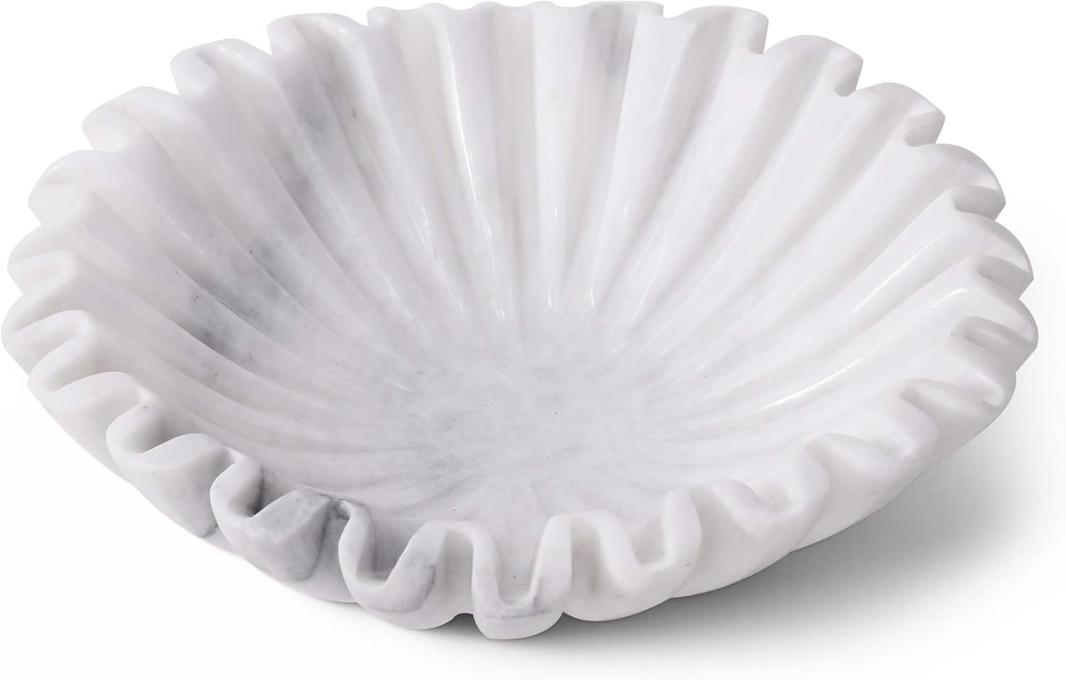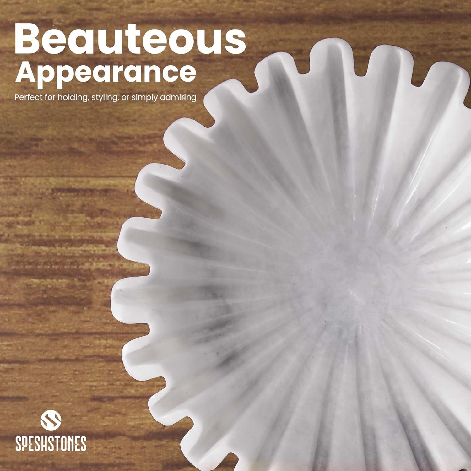 Marble Decorative Bowl 10 Inch Handmade White Fruit Bowl for Kitchen Counter - Large Ruffle & Scalloped Bowls for Dining, Coffee Table Centerpieces & Home Decor