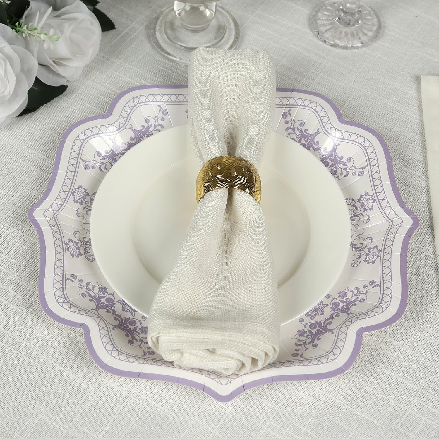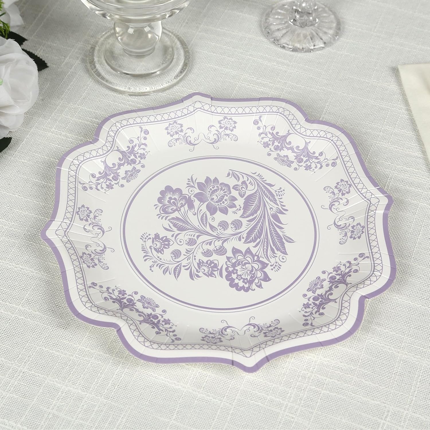 - 25 Pack of 8 Inch Plates: Featuring a charming lavender lilac damask floral print and scalloped rim, these 300gsm dessert plates provide a graceful backdrop for salads and desserts at bridal showers, baby showers, or spring events.