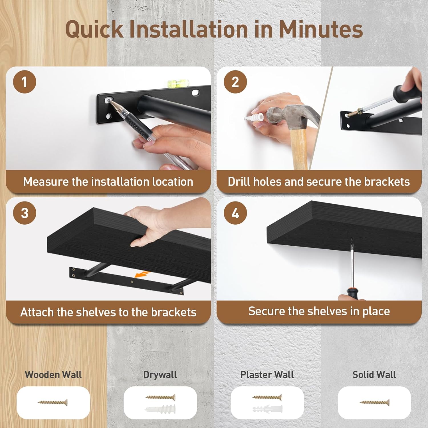 - Sturdy Load-Bearing: Constructed from high-quality thick particleboard paired with dual metal brackets, each 1.5" thick wall floating shelf supports up to 22 lb per shelf. The concealed brackets offer a sleek, minimalist look while ensuring durability and safety