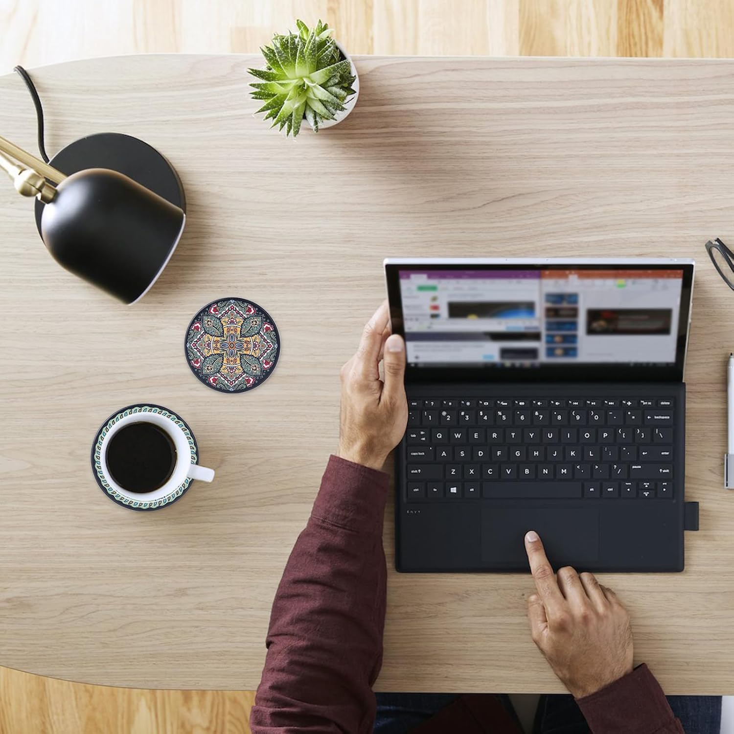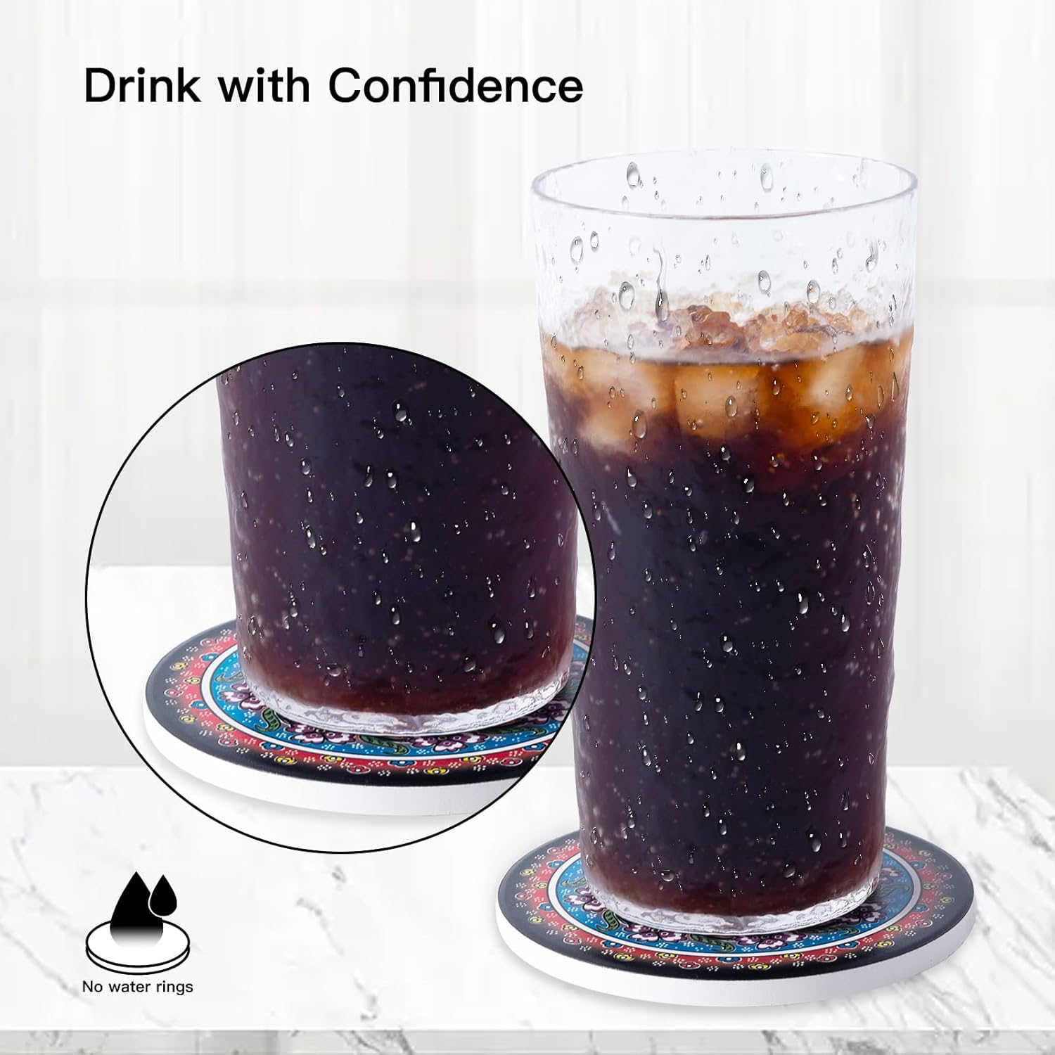 Coasters Absorbent Ceramic Coaster Drink Coasters with Cork Back Turkish Pattern Set of 6 Round Coaster Non Slip for Coffee Table Wine Glass Home Bar 4 Inch, Colorful