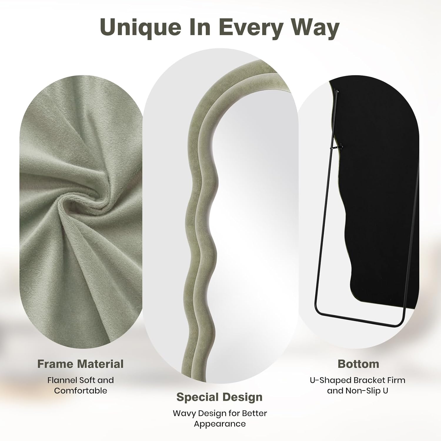 - Sage Flannel Irregular Wavy Frame Floor Mirror: The full length standing mirror features a modern style that can complement any type of room decor, adding a touch of elegance to your room. It will be a great wall decor art piece for your home. This full body mirror with sleek looking is also great for selfies or pictures in general