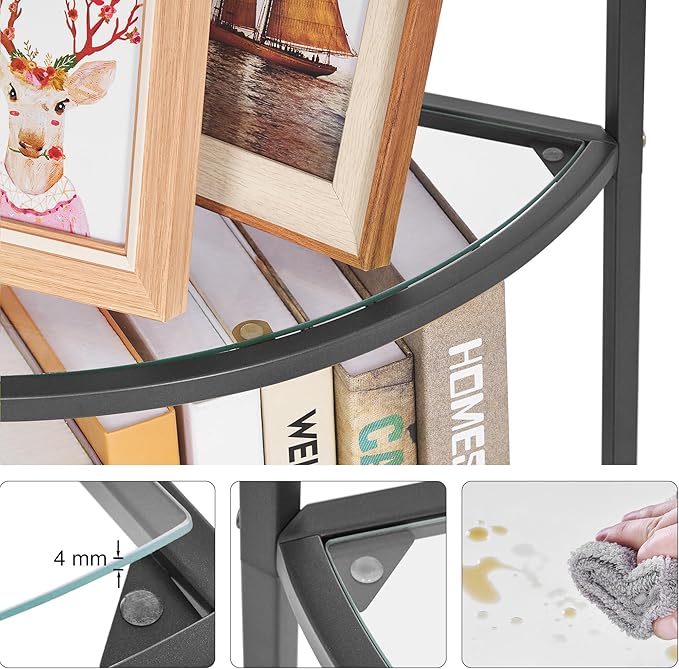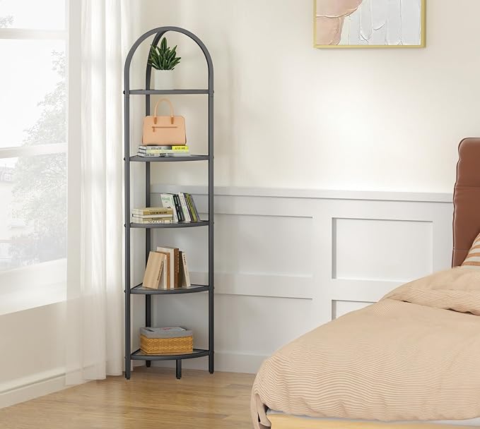 - Stylish and Functional: This 5-tier Steel Frame and glass Corner Shelf with a black finish is great for adding a touch of elegance to your home decor, while also providing ample storage and display space for your books, photos, plants, and other items. The arched design makes it a beautiful addition to any room