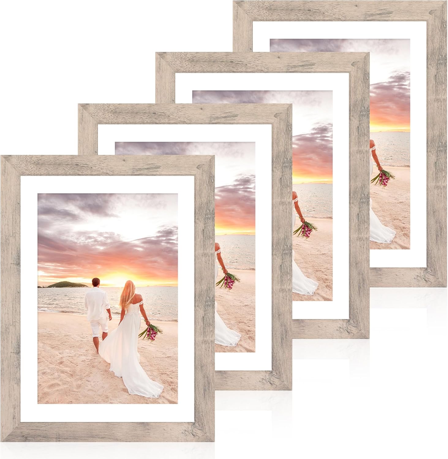 iRahmen 10x14 Picture Frame Set of 4 with Tempered Glass, Smoke Gray Frame Display 8x12 Picture with Mat or 10 x 14 Without Mat, Wood Rustic Photo Frames for Horizontal or Vertical Wall Mounting