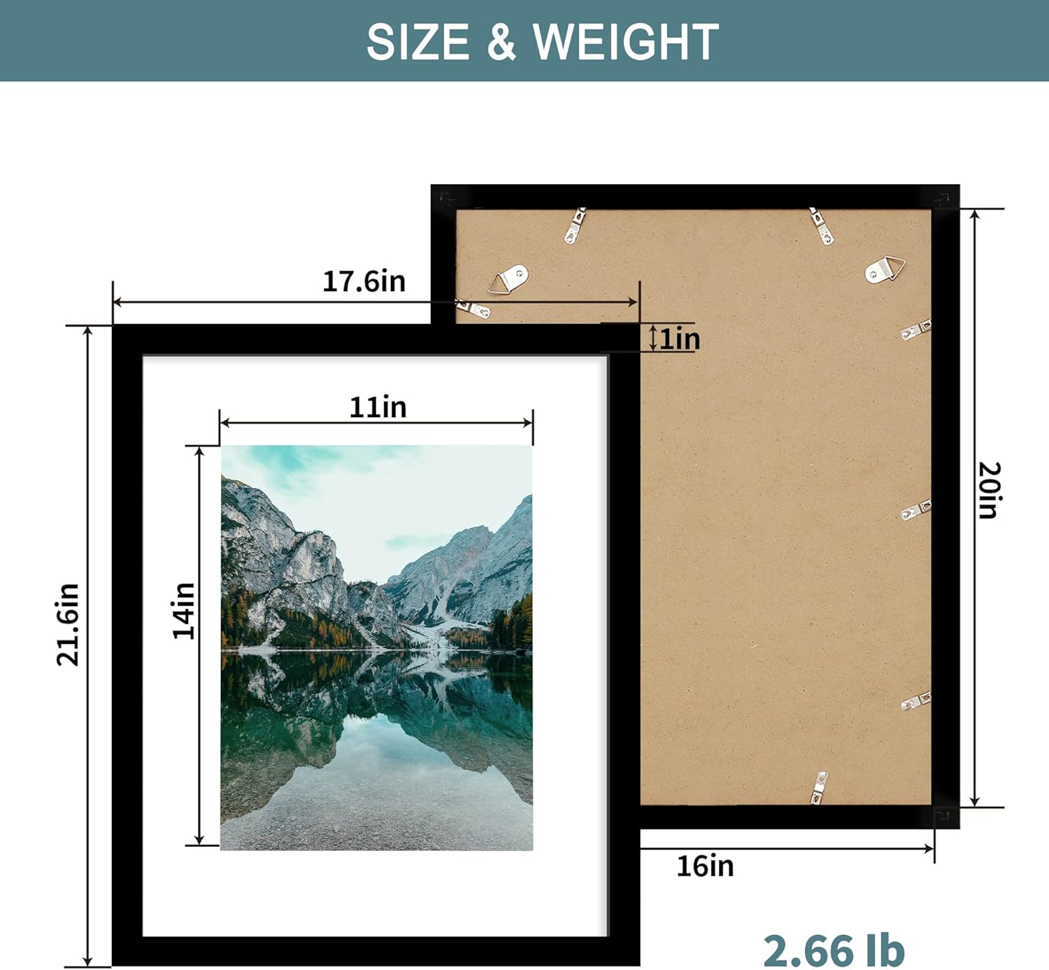 - Double Frames Set: Includes 2 frames in the same size. Perfectly fits 11x14 inch pictures with mat or 16x20 inch without mat. The frame opening display size is 0.5 inches smaller than the photo size for secure mounting.