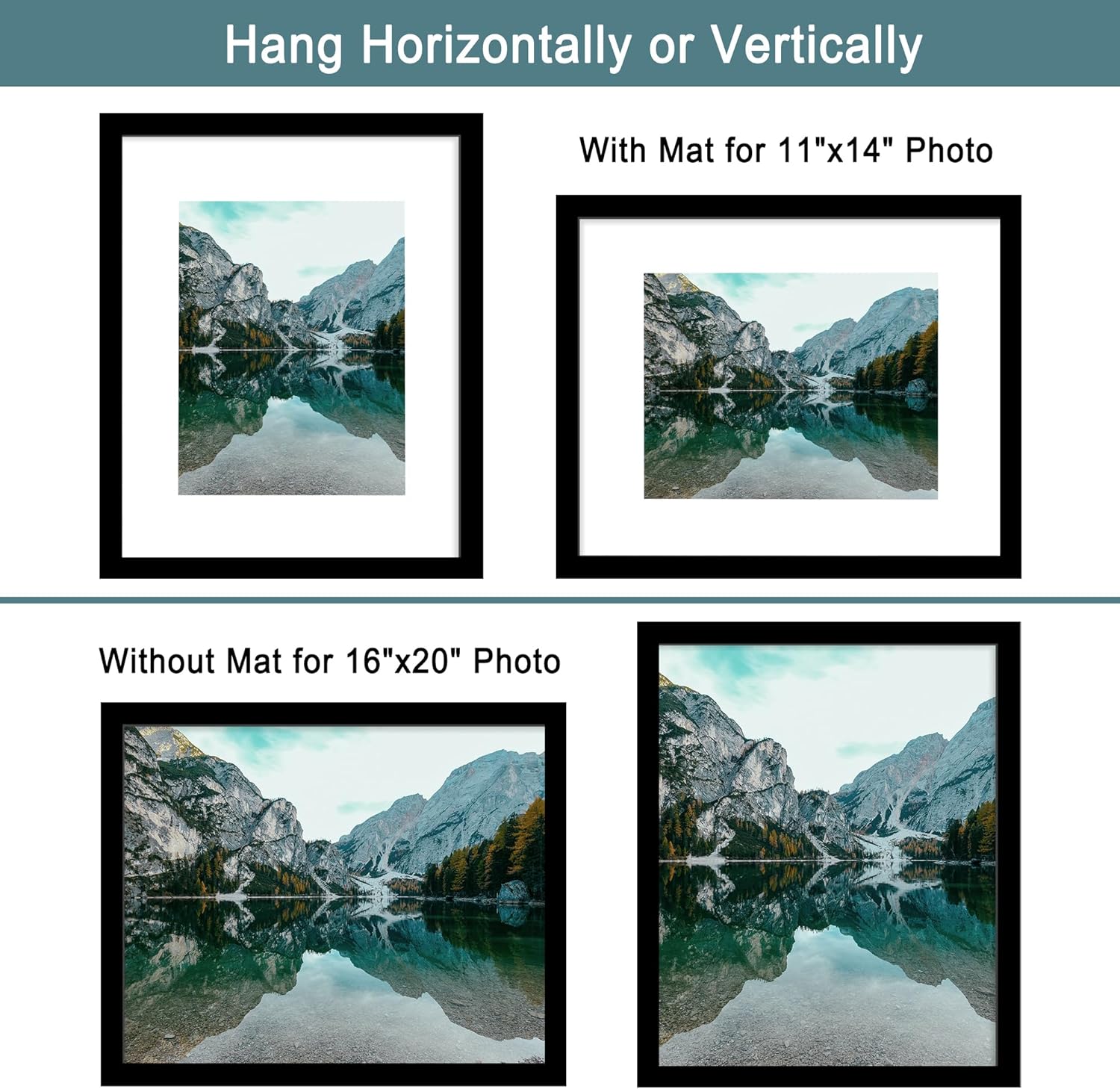 iRahmen 16x20 Picture Frame Set of 2 with Plexiglass, Black Poster Frame Display 11x14 Picture with Mat or 16 x 20 Without Mat, Wood Photo Frame for Horizontal or Vertical Wall Mounting