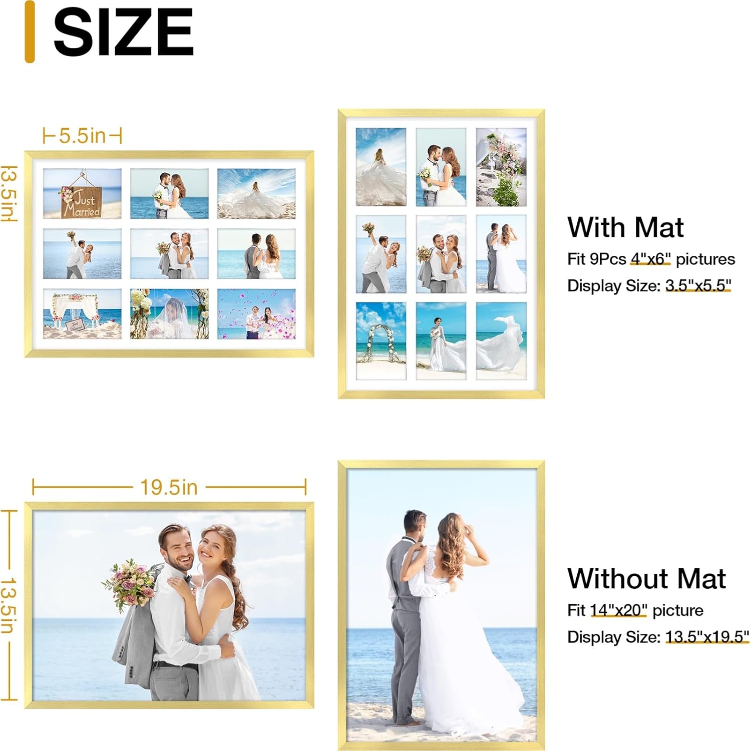 decorUhome 14x20 Picture Frames Collage Wall Decor, Display 9Pcs 4x6 Photos with Mat or 1Pcs 14x20 Unmatted, 9 4x6 Collage Picture Frames for Wall Mounting, Gold
