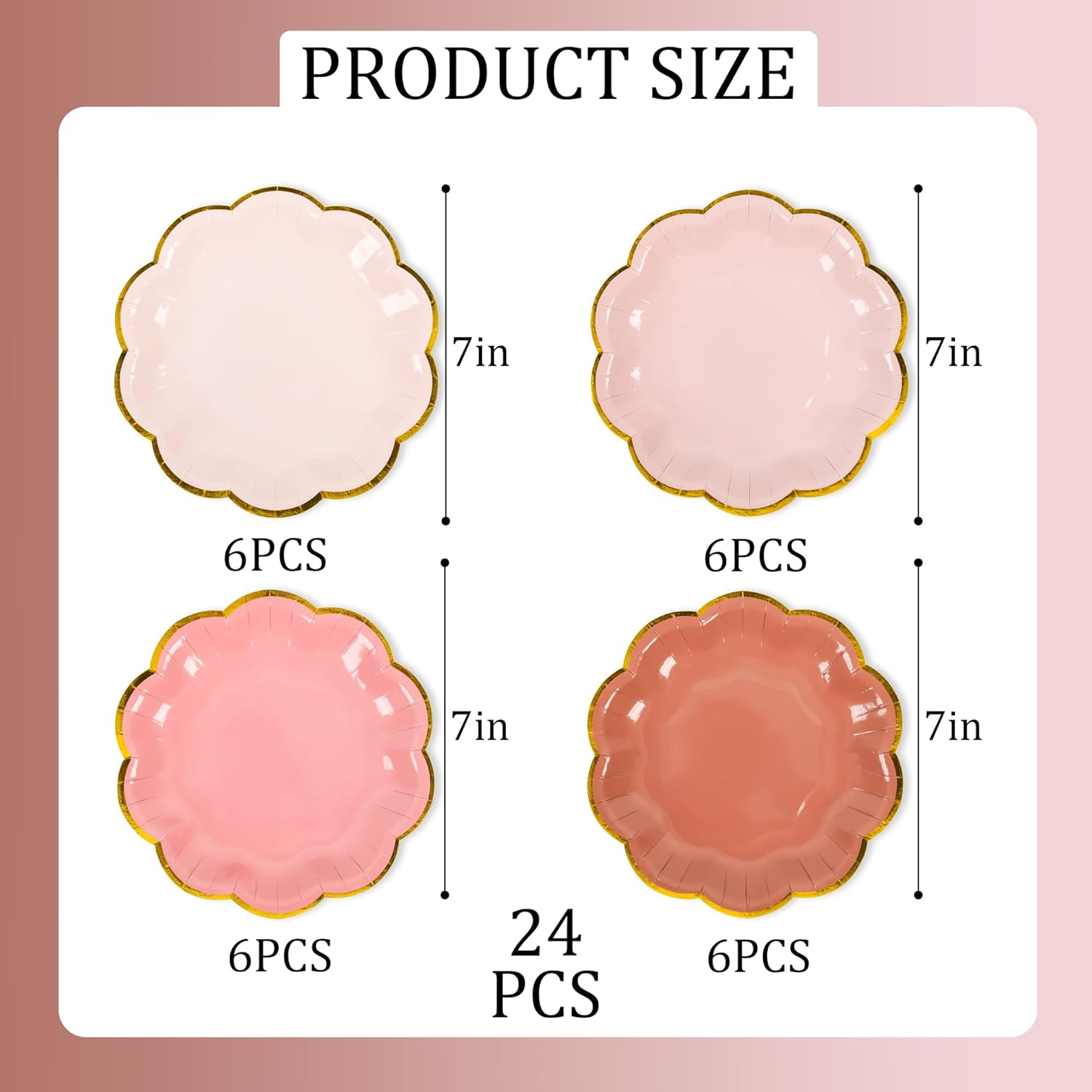 Dusty Pink Gradient Color Dessert Paper Plates 7 inch Gold Foil Scalloped Edge Disposable Cake Plates for Tea Party Birthday Bridal Baby Shower Wedding Party Supplies (24, Dusty Pink)