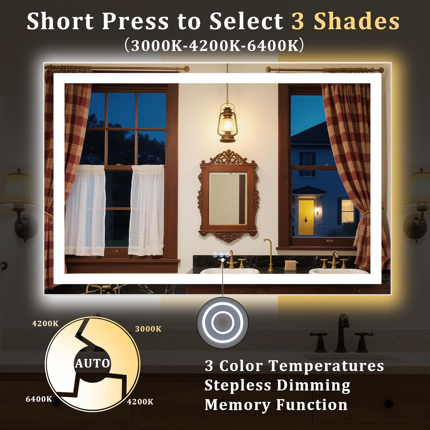 - Professional Lighting: Control your perfect lighting. The bathroom mirror features integrated front & backlight system for higher brightness, and offers three color lights (warm-light, natural-light, cool-light) and adjustable brightness from 10% to 100%. Short press can adjust the color according to the usage situation, while long press can adjust the brightness of the lights, allowing you to have salon level control over any task or emotion