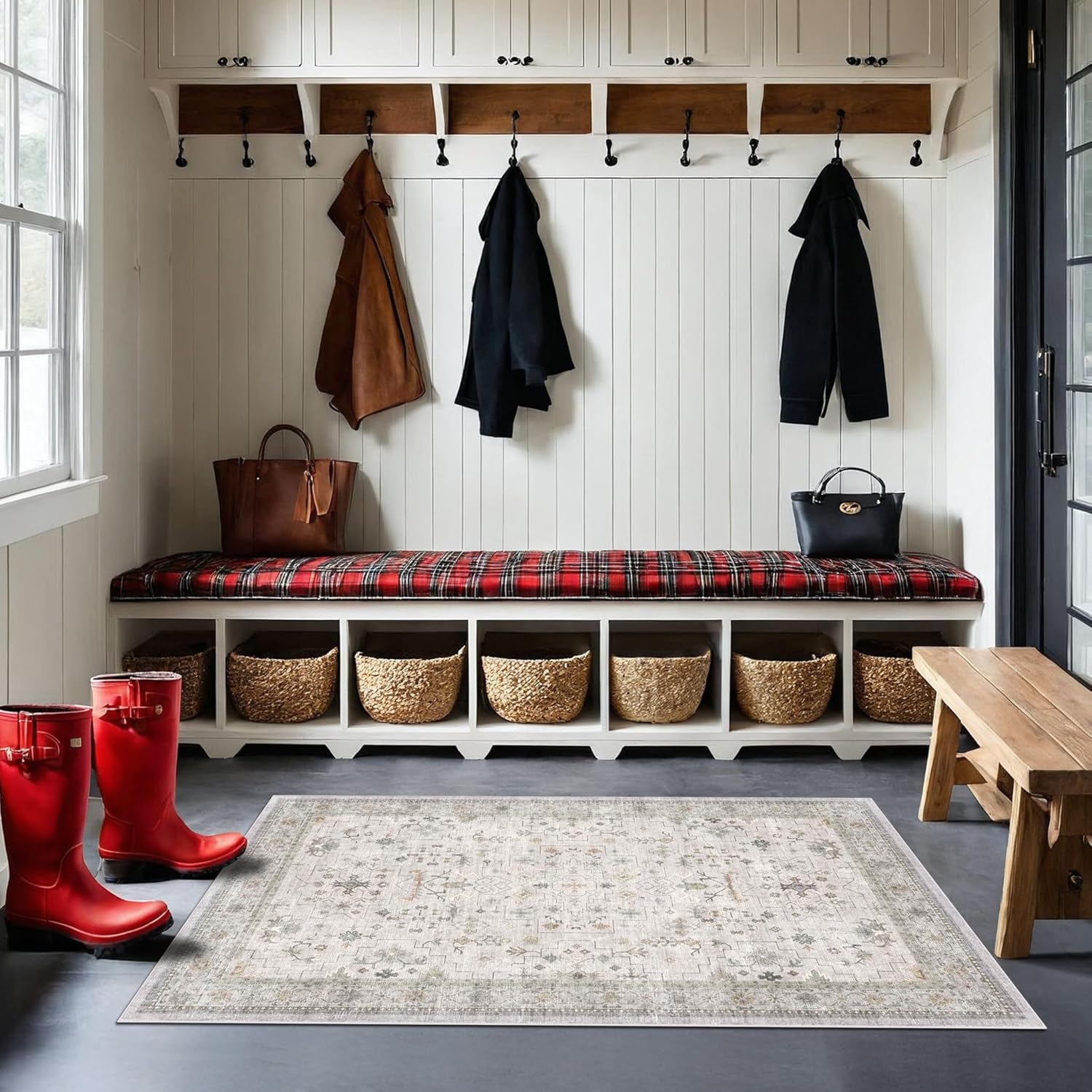 Light Grey 3x5 Large Boho Bathroom Rug - Modern Vintage Eclectic Floral Pastel Neutral Taupe, Washable Low Pile Non-Slip Area Rugs for Entryway, Kitchen, Bedroom Beside Bed, Laundry