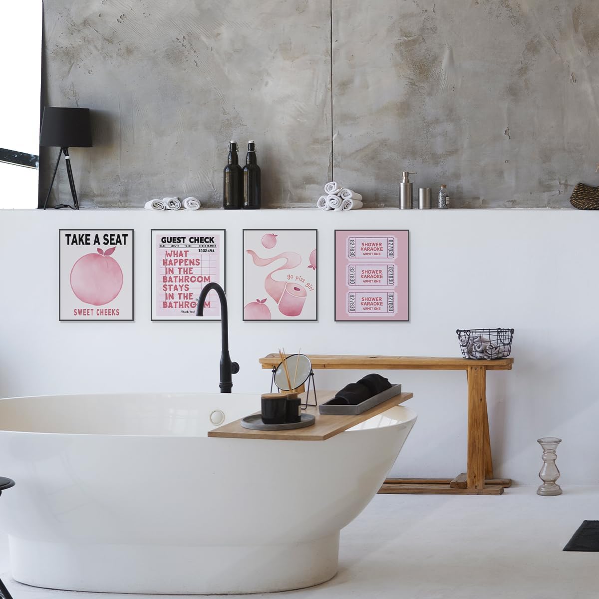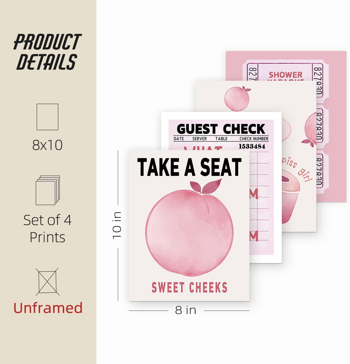 ETVISO Funny Pink Girls Peach Bathroom Decor Wall Art Posters Set of 4, Funny Pink Cute Shower Karaoke Ticket Guest Check Wall Decor for Girls Bathroom Washroom Restroom Toilet, 8x10 Inch (Unframed)