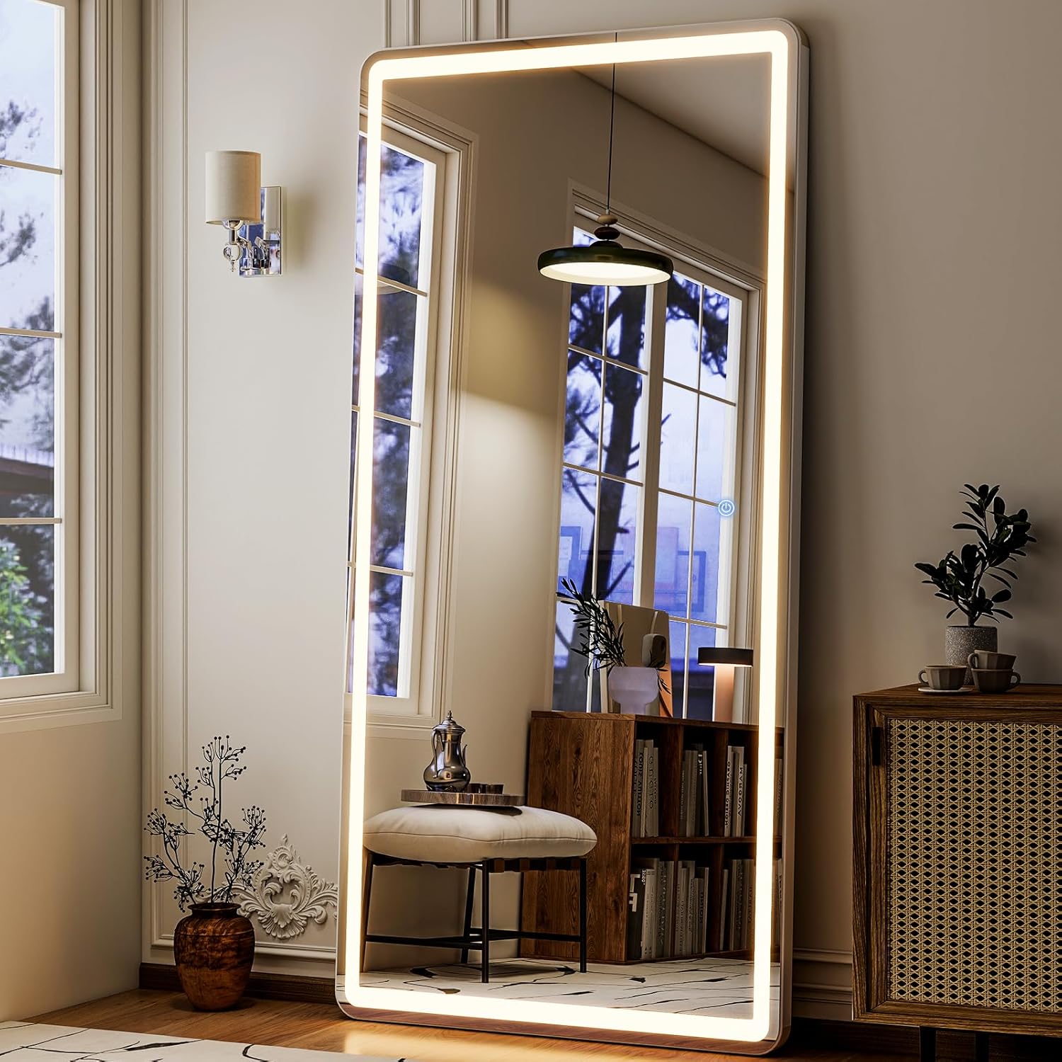 GLSLAND 65x26 LED Mirror Full Length, Aluminum Alloy Floor Mirrors with Lights, 3 Color Lighting & Dimming for Bedroom Decorative Wall Mounted, White