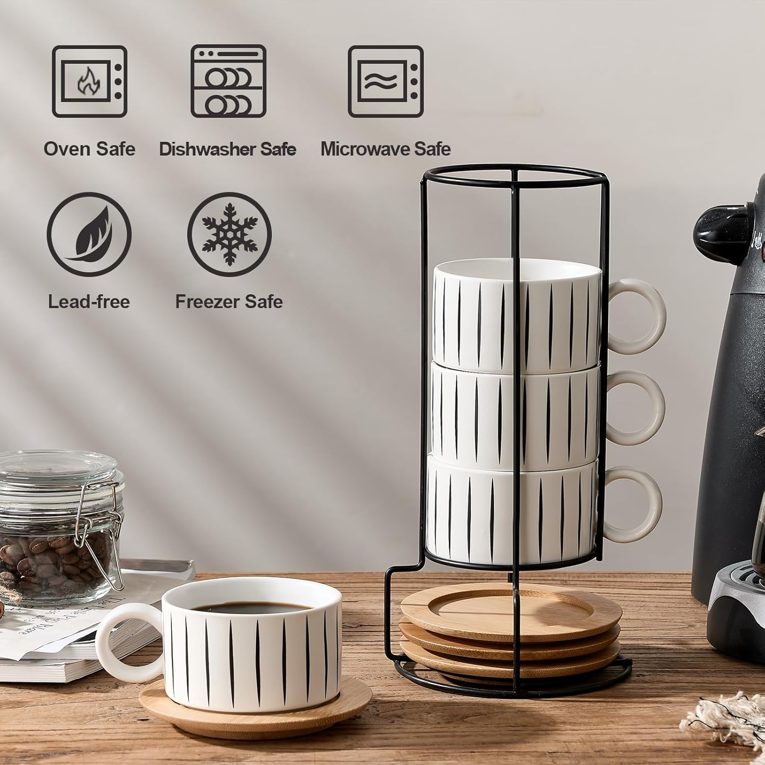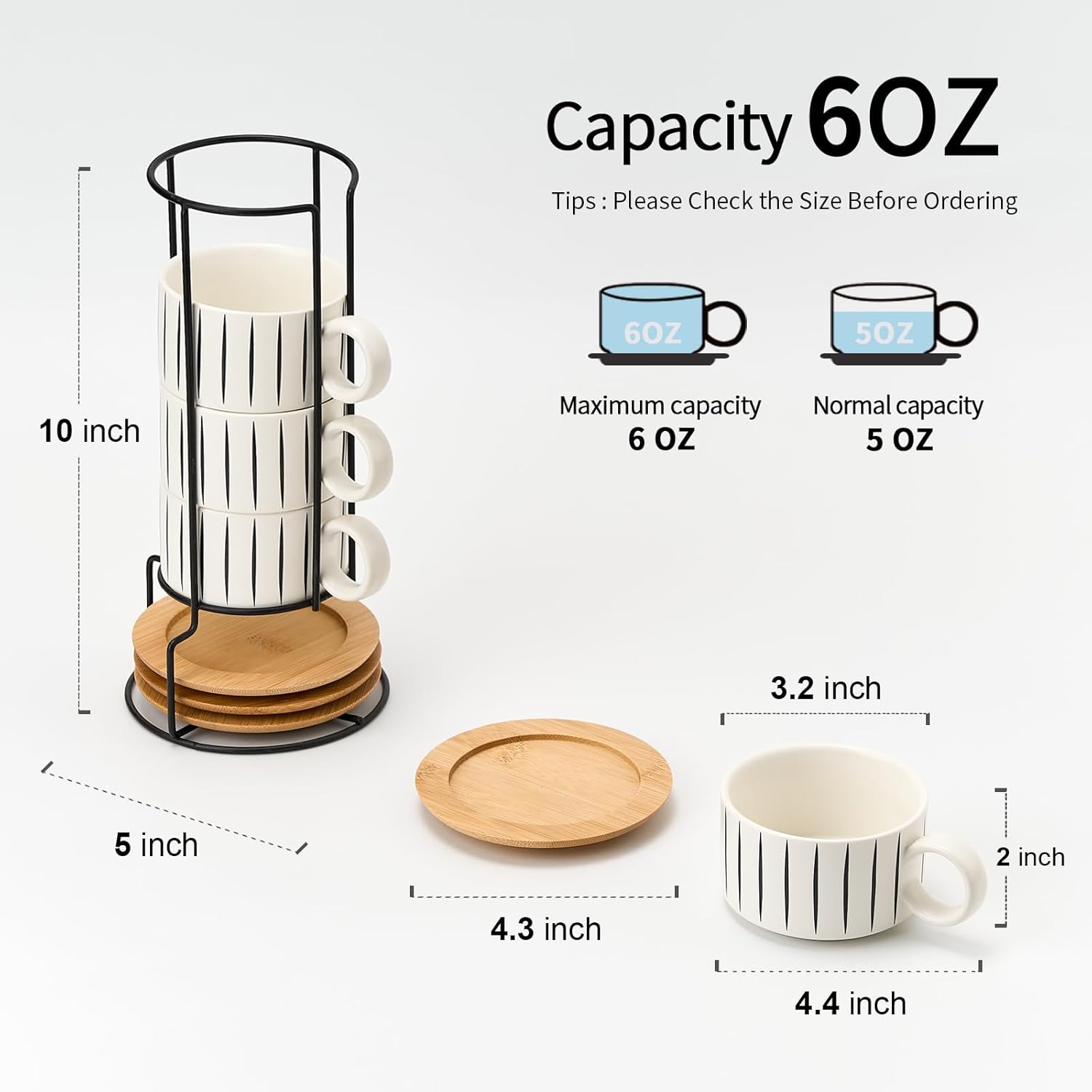 LUKA 6 Ounce Porcelain Stackable Espresso Cups with Saucers and Metal Stand Set of 4, Ceramic Cappuccino Cups Set for Specialty Coffee Drinks, Latte, Cafe Mocha and Tea, Stripes, White