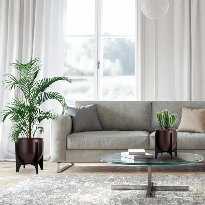 - MORDEN MINIMALIST DESIGN:Add a touch of sophistication to your room with this set of two metal planters that come with sturdy metal stands. The planters feature a sleek and modern design style that creates an elegant ambiance,and it will be an eye-catching decoration in your room.