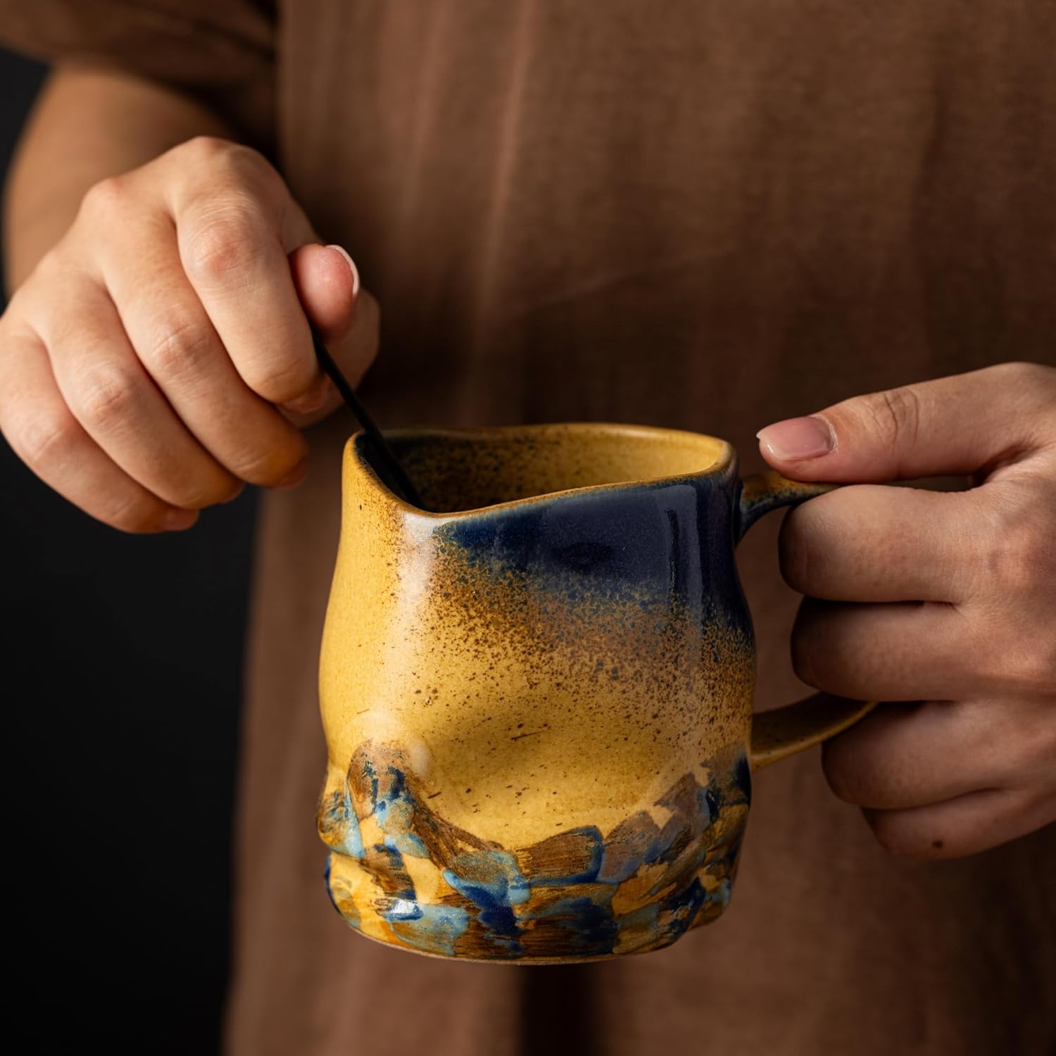 Handmade Ceramic Coffee Mugs, Mugs with Coffee Spoon, 11oz, Handmade Pottery Mug with Handle, Hand-painting, Unique Uneven Surface Tea cups, Dishwasher and Microwave Safe (Yellow)