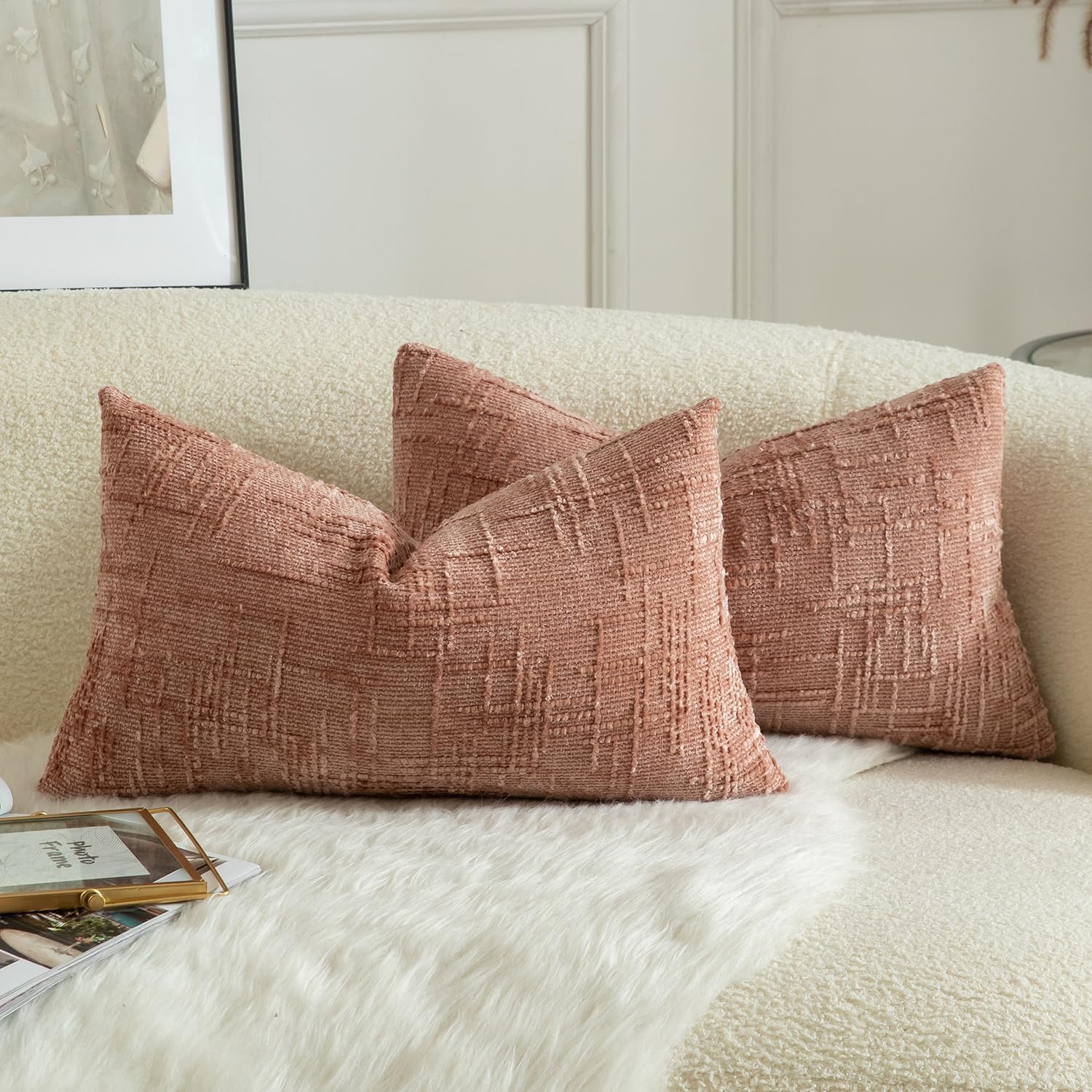 MANDIOO Pack of 2 Soft Chenille Textured Throw Pillow Covers Lumbar Accent Solid Decorative Cushion Cover Cozy Farmhouse Pillow Case for Couch Sofa Bed Living Room 16x24 Inch Dusty Pink