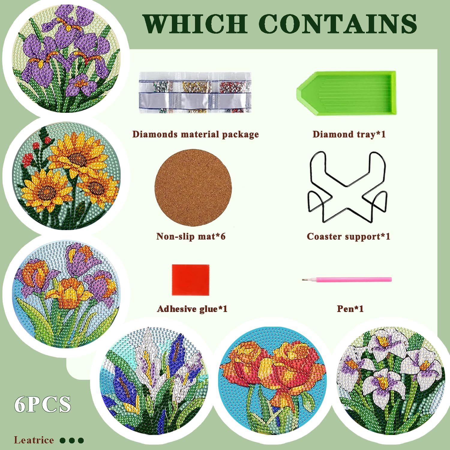 Leatrice 6PCS Flower Diamond Art Coasters Small Diamond Painting Kits for Adults Diamond Dots Round Full Drill Diamond Coasters with Holder Easy Art Crafts for Beginners Women
