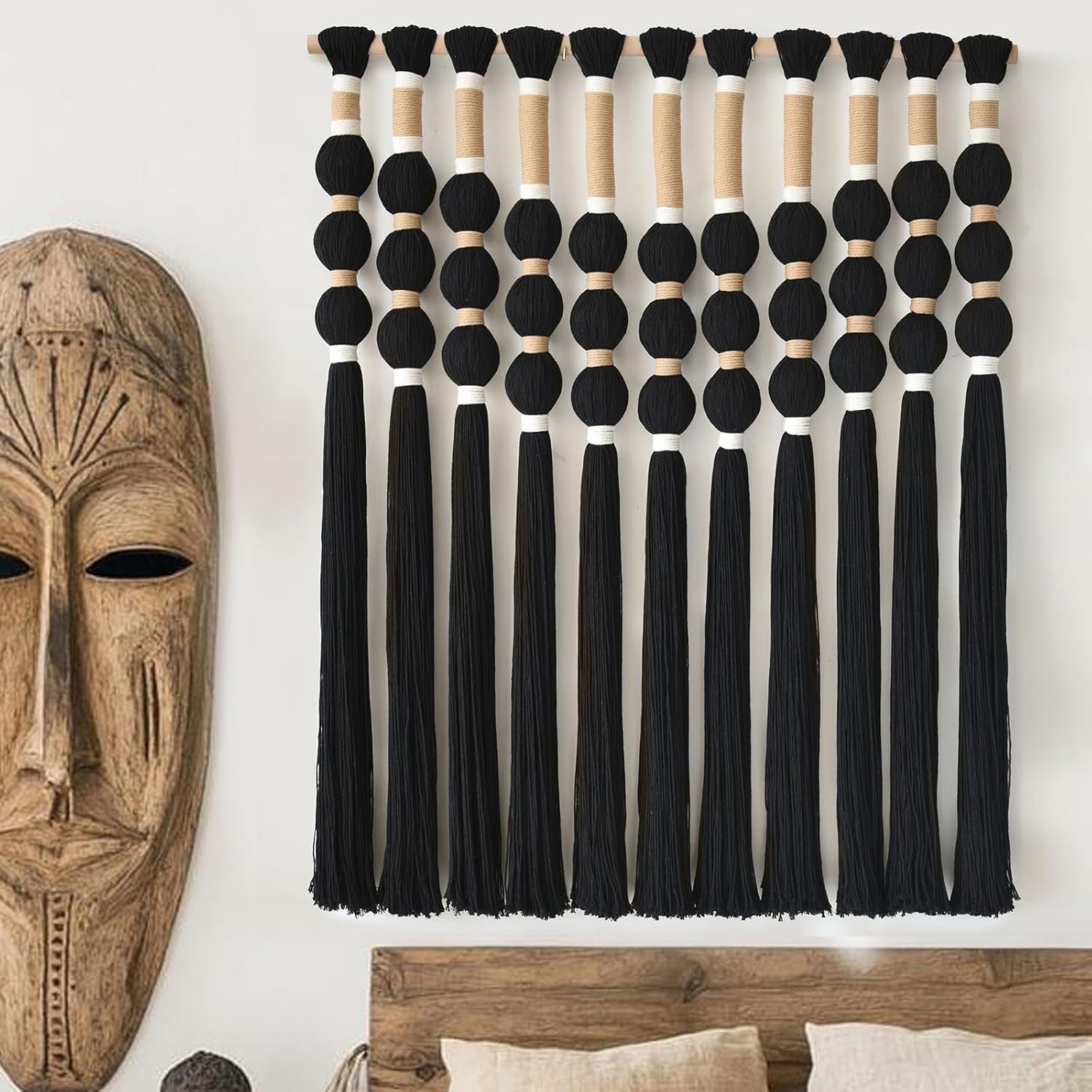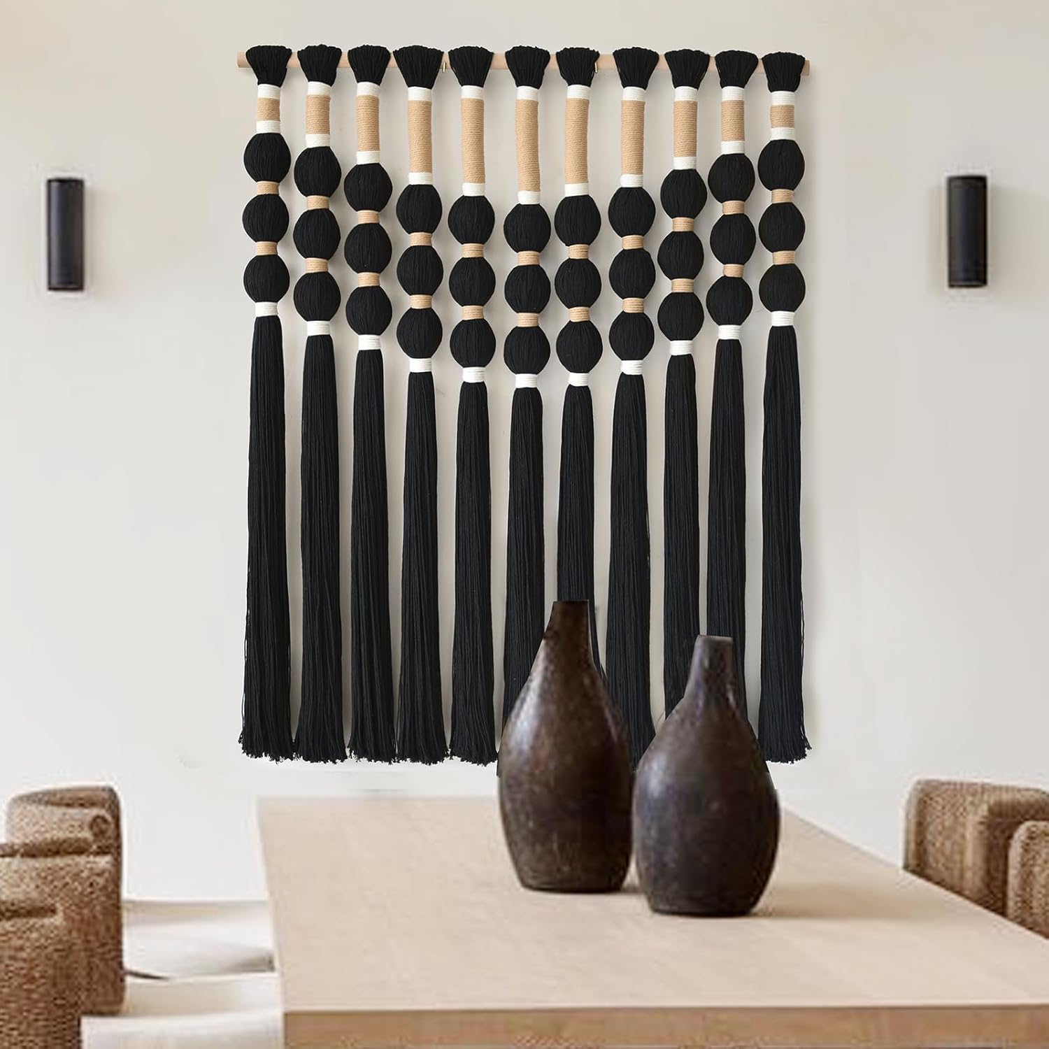 - Note:This black wall decor is hand-woven with soft cotton thread. During the long-distance transportation, some yarns may be slightly entangled or creased. It is recommended to comb the tassels gently with a comb during installation, and then hang the product for a few days, and the tassels will naturally droop and return to their original state.