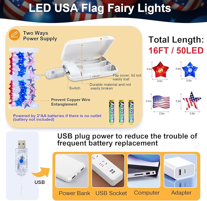 - Patriotic American Flag & Star Fairy Lights: Brighten up the Independence Day with the flags and stars decorative string lights which comes with 50 LED flags and stars in red, white, blue colors, vivide and bright.Creating a beautiful display for your 4th of July Memorial Day patriotic decorations celebration