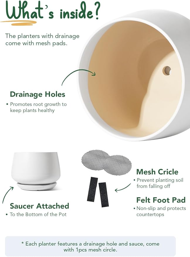- 10" + 12" Versatile Set: A smarter choice than a single 12" Pot! This planters includes 2 sizes—10 inch and 12 inch body sizes—with an 8 inch opening for the 10 inch plant pot and a 9.8” opening for the 12 inch plant pot, offering the perfect balance of style and practicality. With drainage hole, saucer, mesh pad, and rubber feet, it ensures healthy roots and a tidy home (Plants not included; tray are one-piece design)