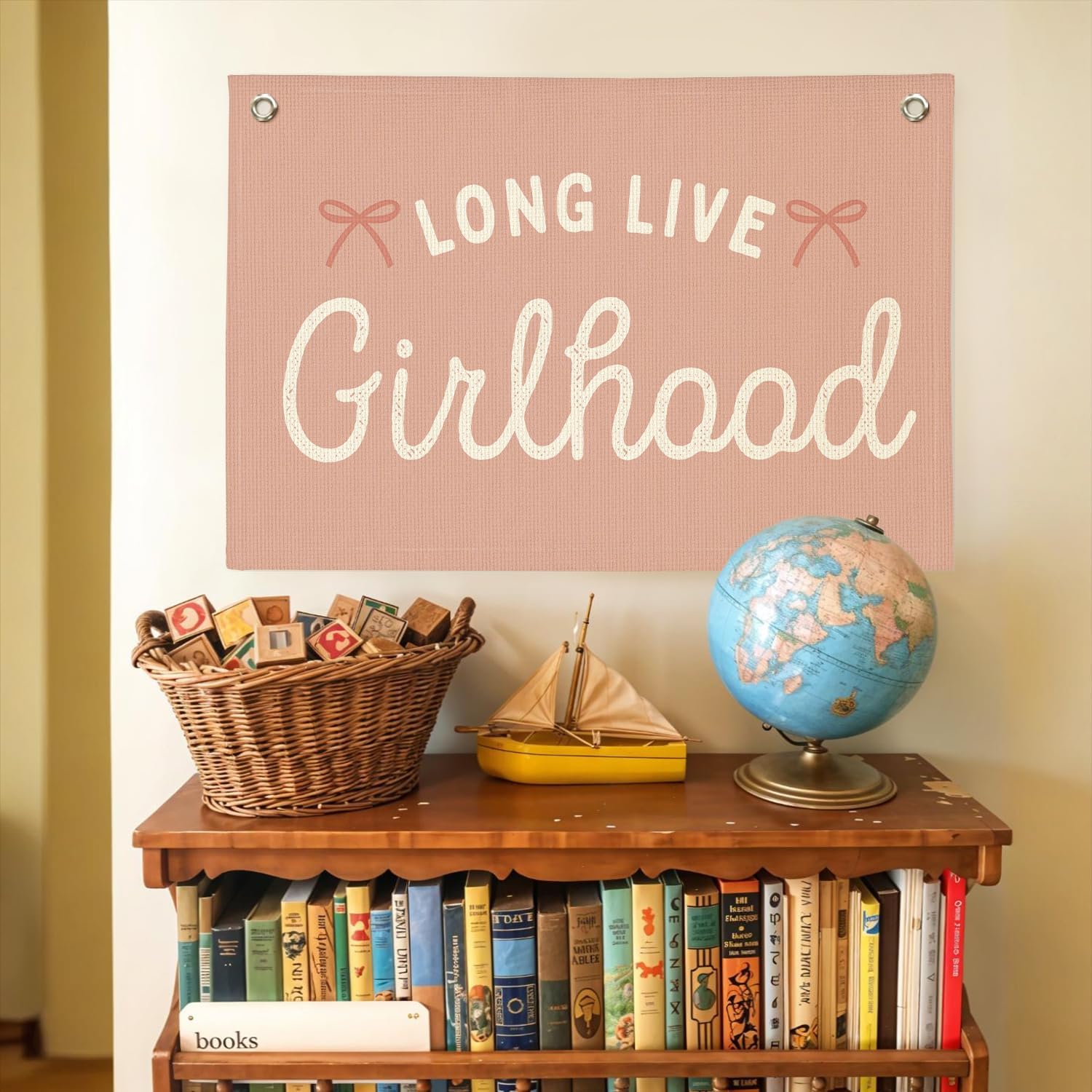 Girls Nursery Decor,Long Live Girlhood Linen Canvas Banner,Boho Girls Room Decor – Coquette Pink Bow Wall Hanging for Nursery Bedroom 30x20 Inch