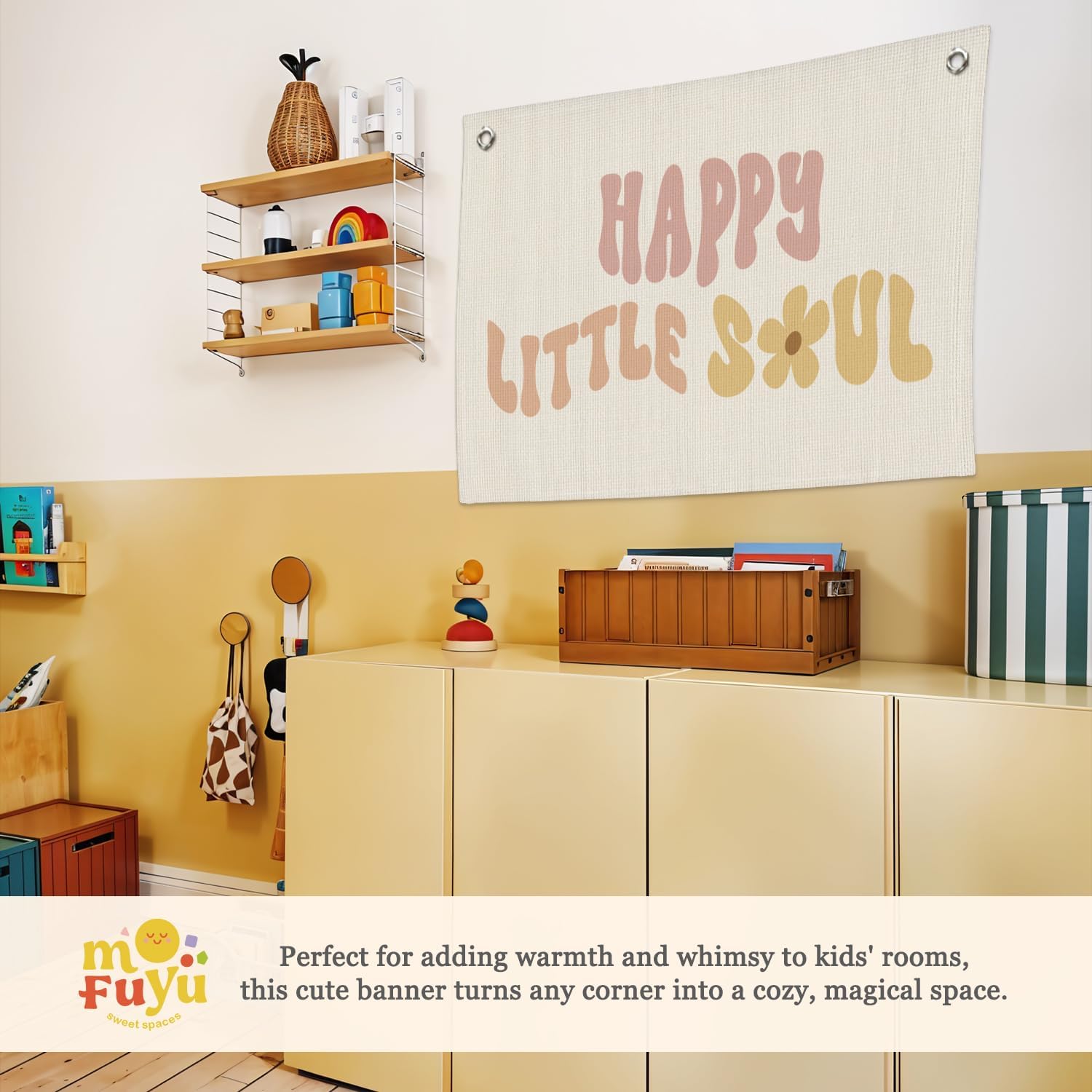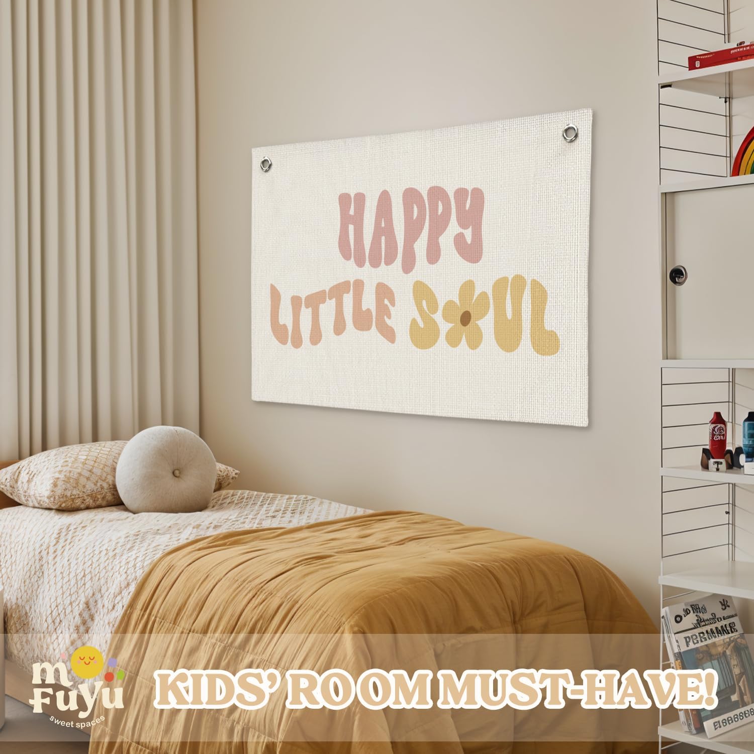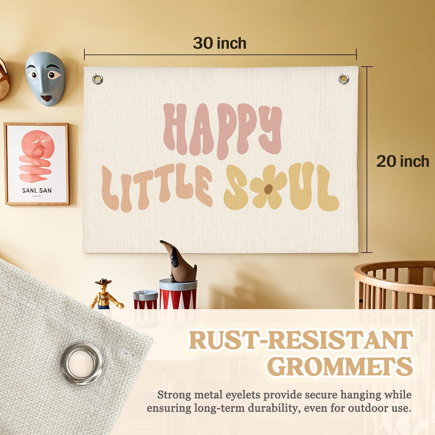 Girls Nursery Decor,Baby Girl Wall Decor,Happy Little Soul Linen Canvas Banner – Boho Inspirational Wall Hanging for Kids Room, Nursery and Playroom – 30x20 Inch