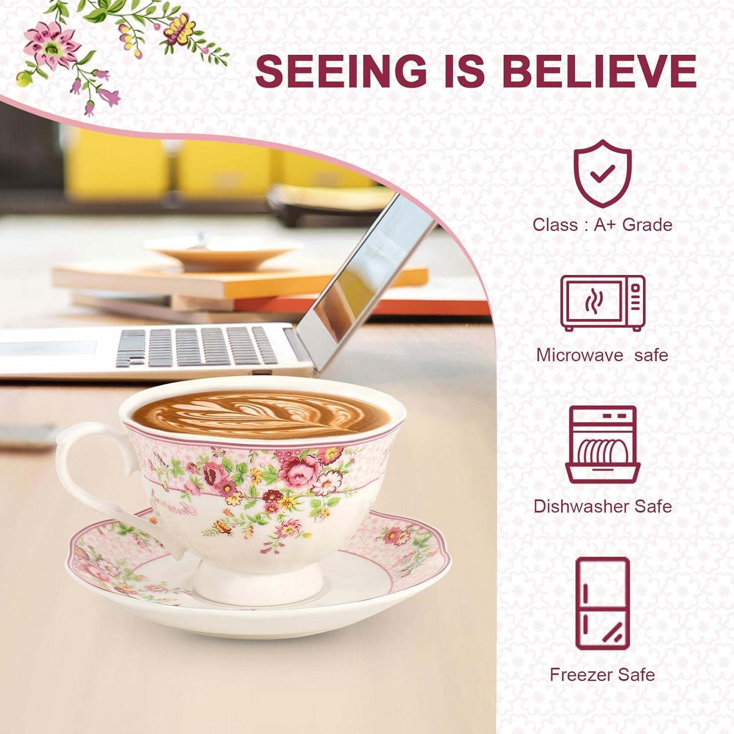 - Made of the New Bone China, Lightweight and Translucent, A-Grade Quality : 8oz coffee cup saucer sets for 6 with spoon is crafted from the new bone china, which is lightweight, translucent, and offers an exquisite high-end look. The high-temperature firing process ensures durability and sturdiness, while the smooth, mirror-like surface reflects its A-grade quality. This set provides long-lasting use and an exceptional visual experience for everyday use.