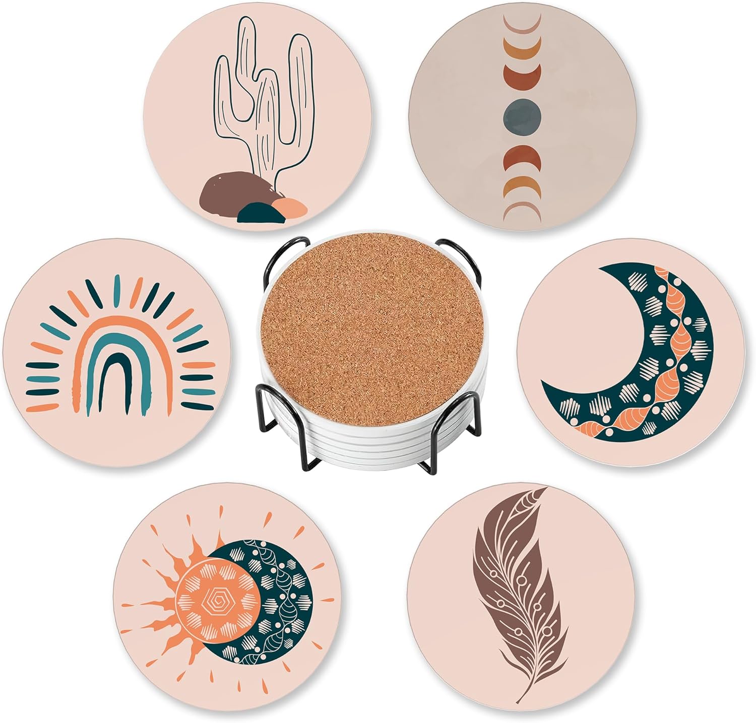 Drink Coasters for Drinks Set of 6, Boho Art Absorbent Round Ceramic Stone Mat Coaster, with Cork Base and Metal Holder, Home Bar Decor House Warming Gift
