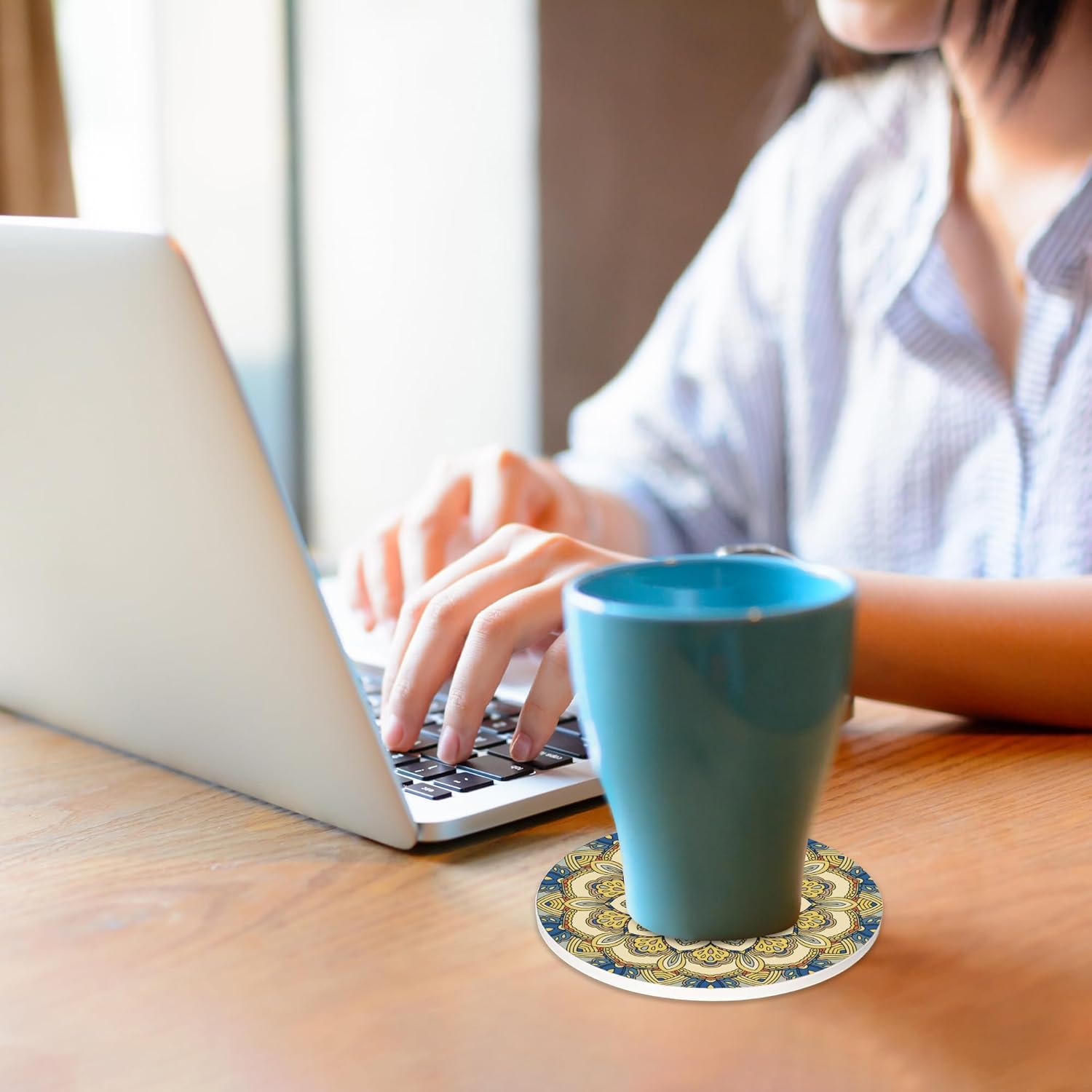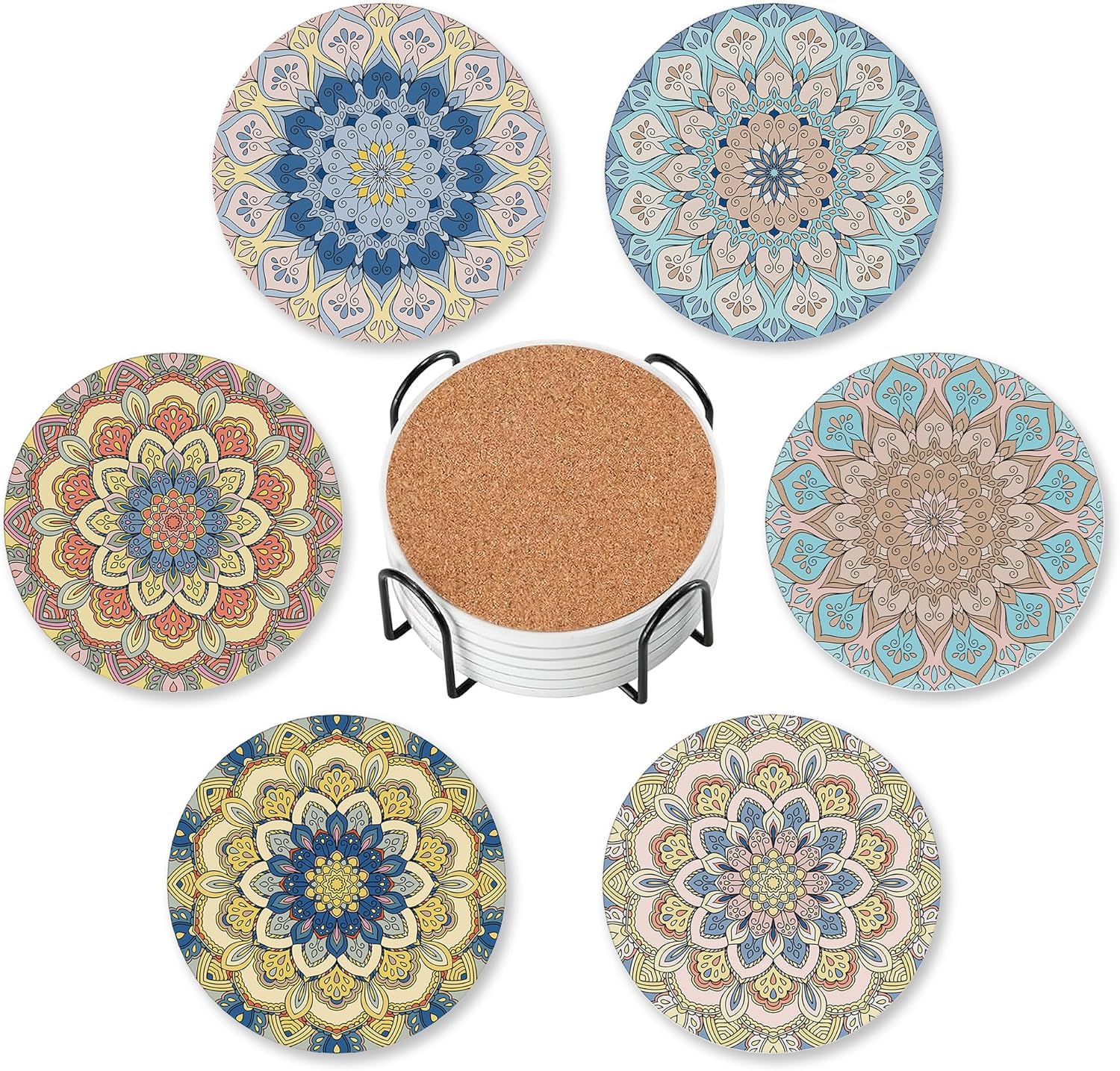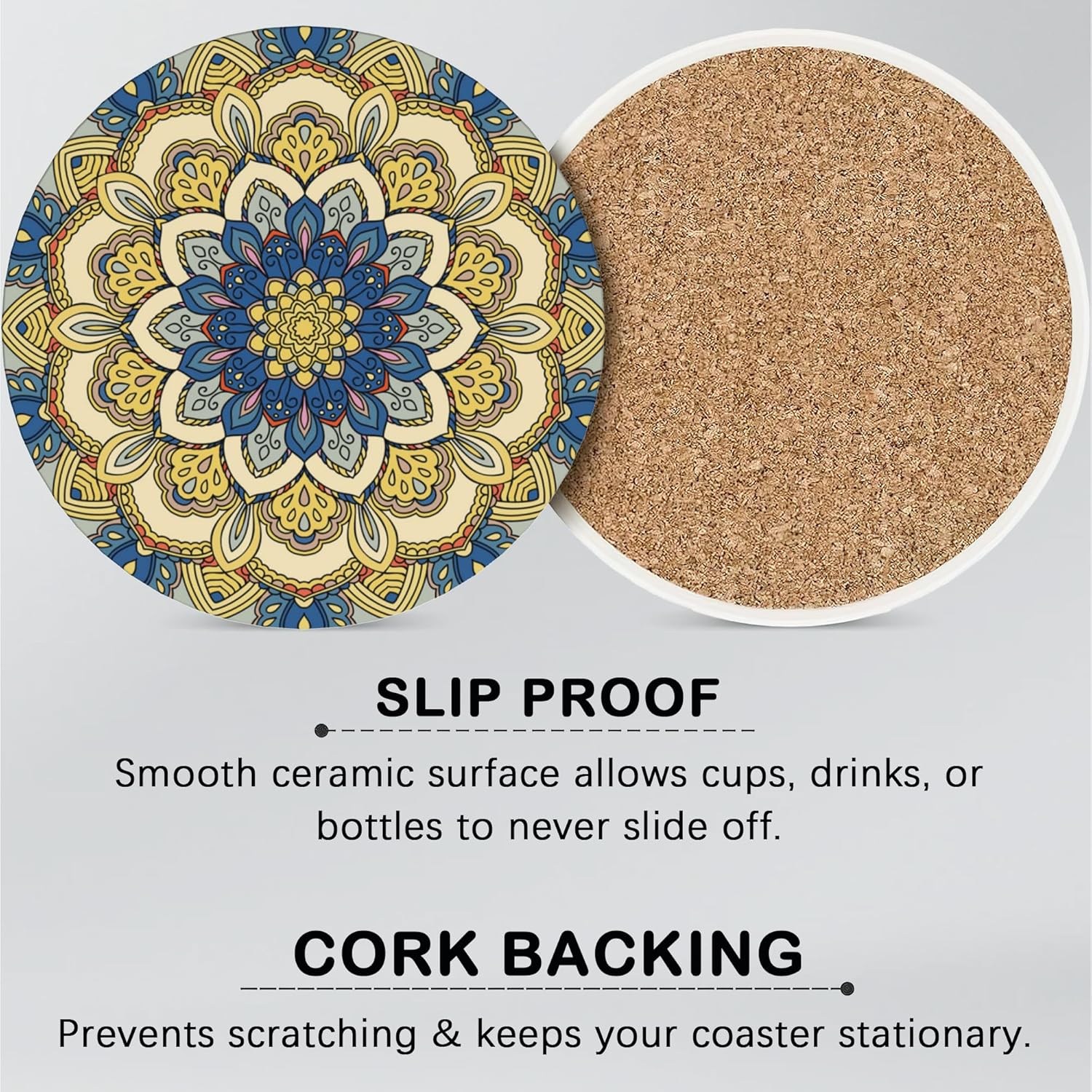 Mandala Set of 6 Coasters for Drinks Absorbing Round Ceramic Stone Coaster with Cork Base,Tabletop Protection Mat for Mugs and Cups,Office,Kitchen