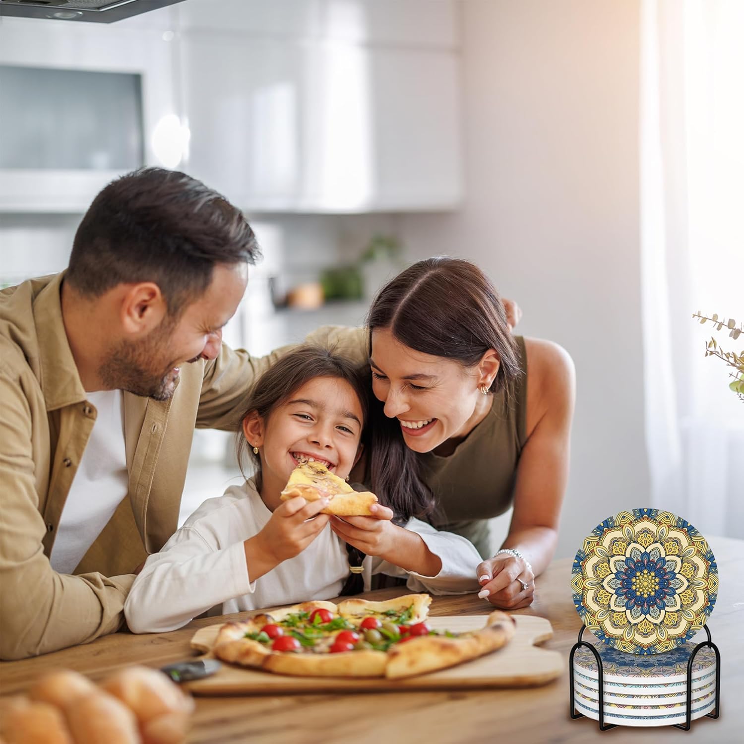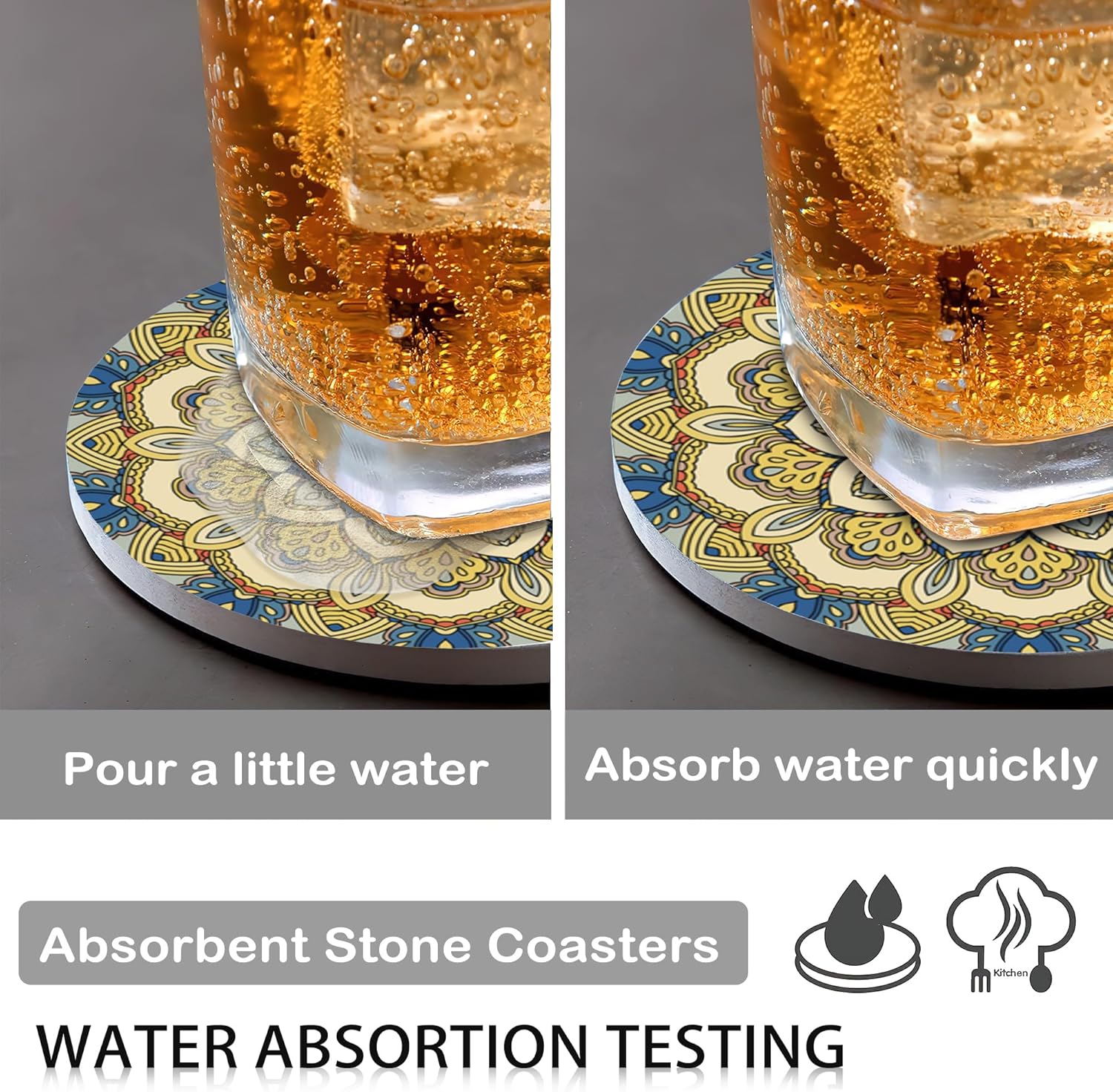 - Stylish Coaster Set with Metal Stand: Elevate your decor with our set of 6 vibrant, round absorbent ceramic coasters. Each coaster features intricate patterns that add a touch of charm to any coffee table, bar, or dining area. The included metal holder keeps them organized and stylishly displayed.