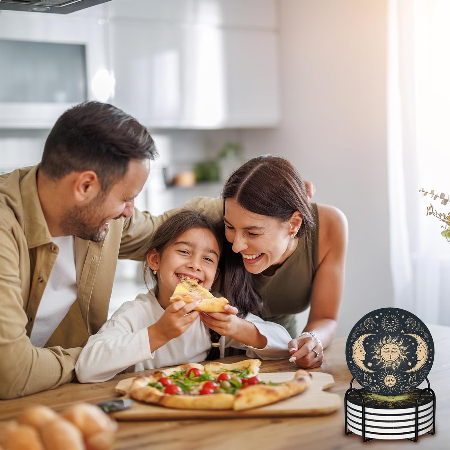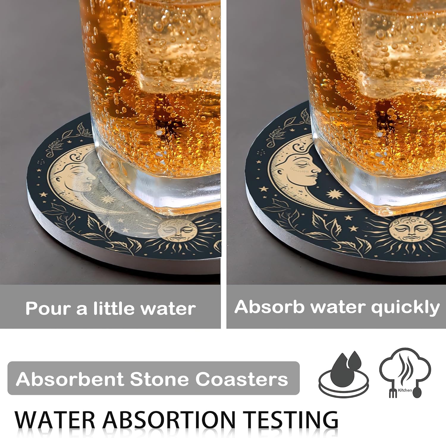 Drink Coasters for Drinks Set of 6,Golden Sun and Moon Absorbent Round Ceramic Stone Mat Coaster,with Cork Base and Metal Holder, Home Bar Decor House Warming Gift