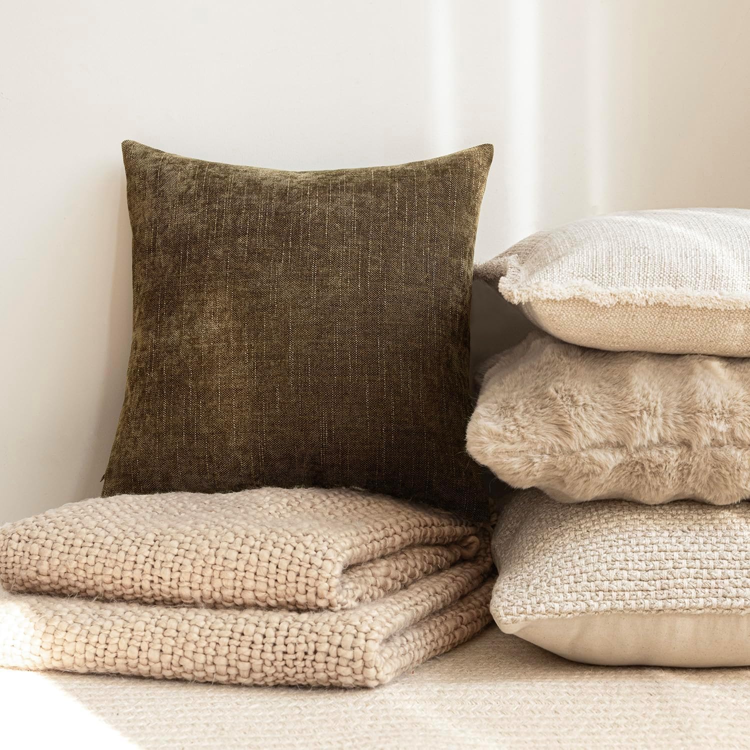 Foindtower Pack of 2 Soft Textured Chenille Throw Decorative Pillow Covers Square Accent Solid Cushion Cover Neutral Farmhouse Pillow Case for Couch Sofa Bedroom Living Room 16x16 Inch,Taupe Brown