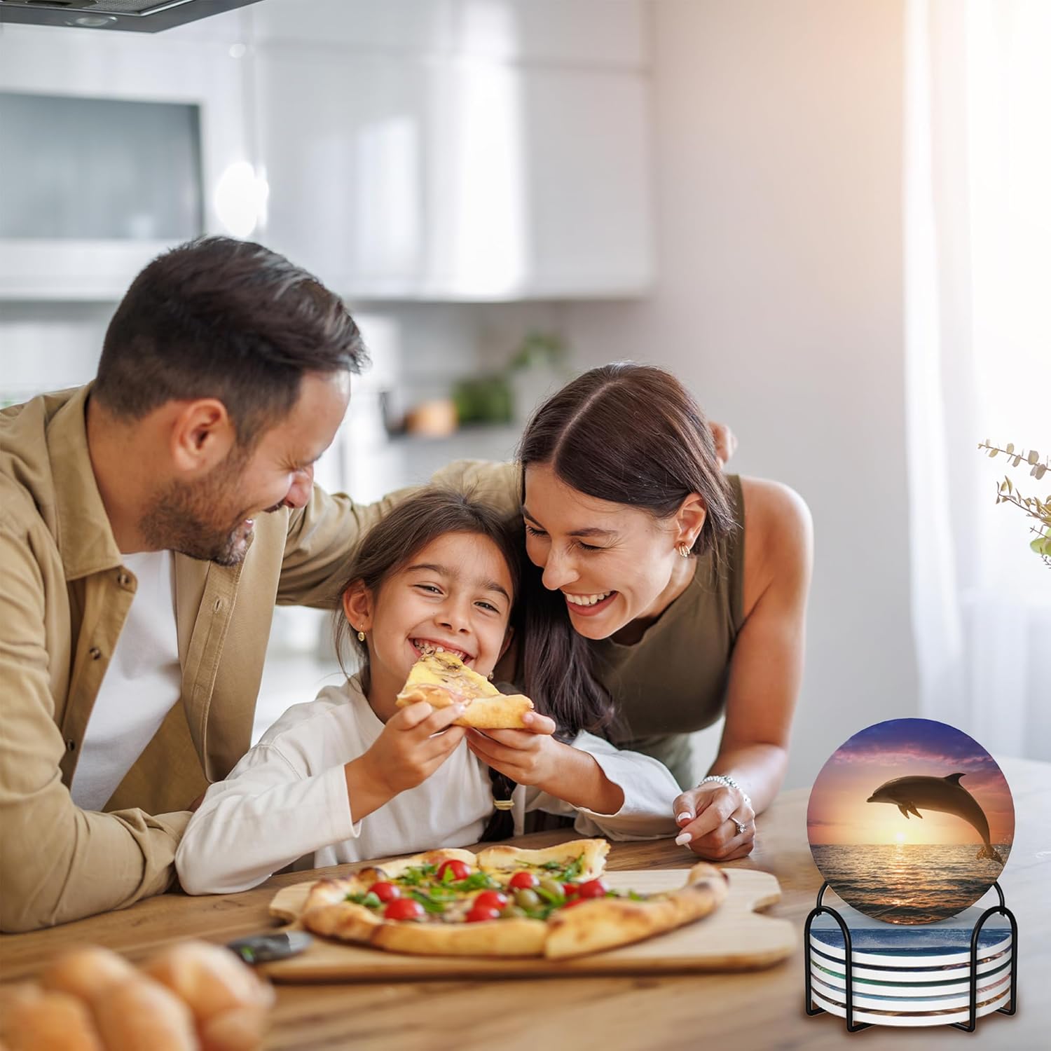 Dolphin Coasters for Drinks Absorbent with Holder,Jumping in Sea Under Sun Sets of 6 Durable Cup Coaster for Coffee Table Protection,Great Housewarming Birthday Gifts,Home Decor